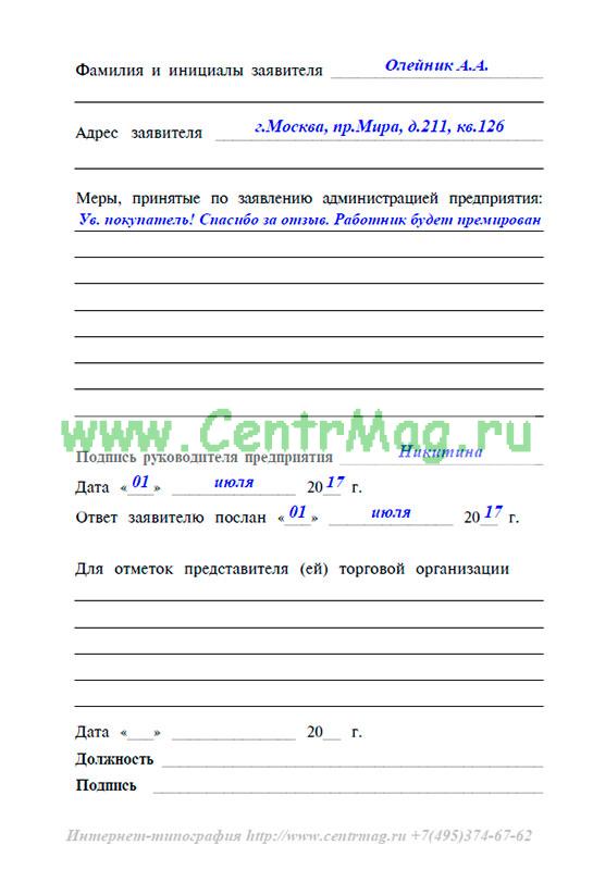 9. Руководитель предприятия розничной торговли, общественного питания и бытового обслуживания обязан рассматривать все жалобы и замечания, внесенные в книгу отзывов и предложений в сроки, которые определены Федеральными законами и иными нормативными актами Российской Федерации для каждого конкретного случая, и принимать необходимые меры к устранению отмеченных недостатков. Для сведения лица, написавшего жалобу, в книге отзывов и предложений на оборотной стороне заявления, руководитель делает отметку о принятых мерах и направляет письменный ответ заявителю, указавшему адрес. Копии ответов покупателям хранятся у руководителя в течение 1 года.