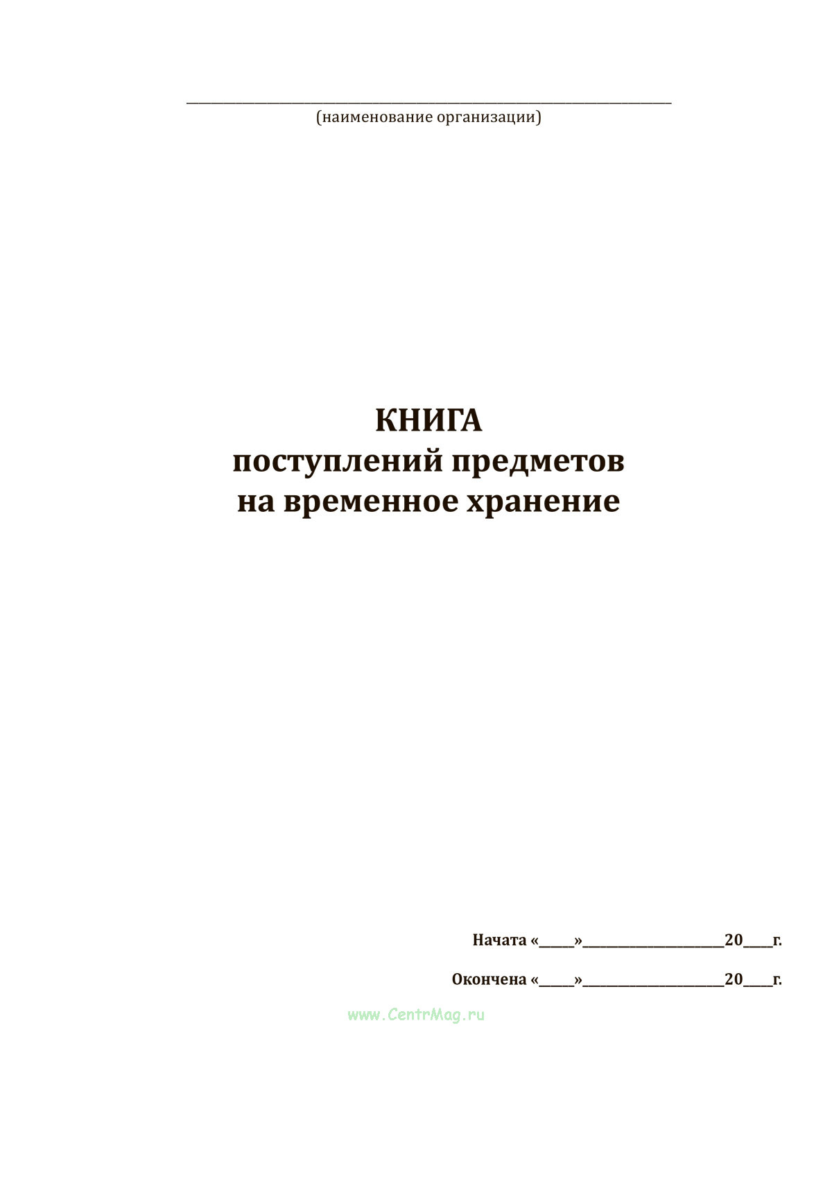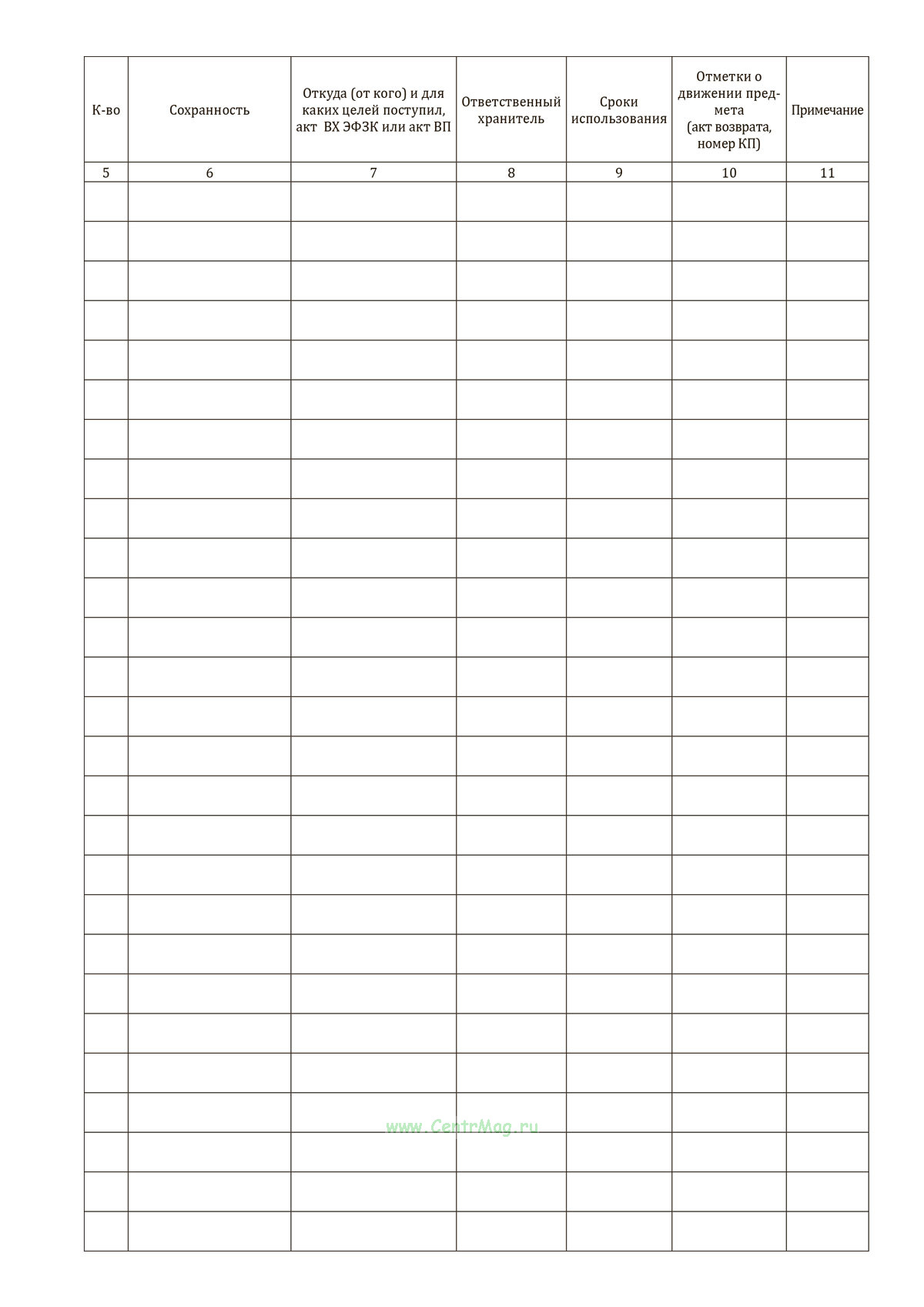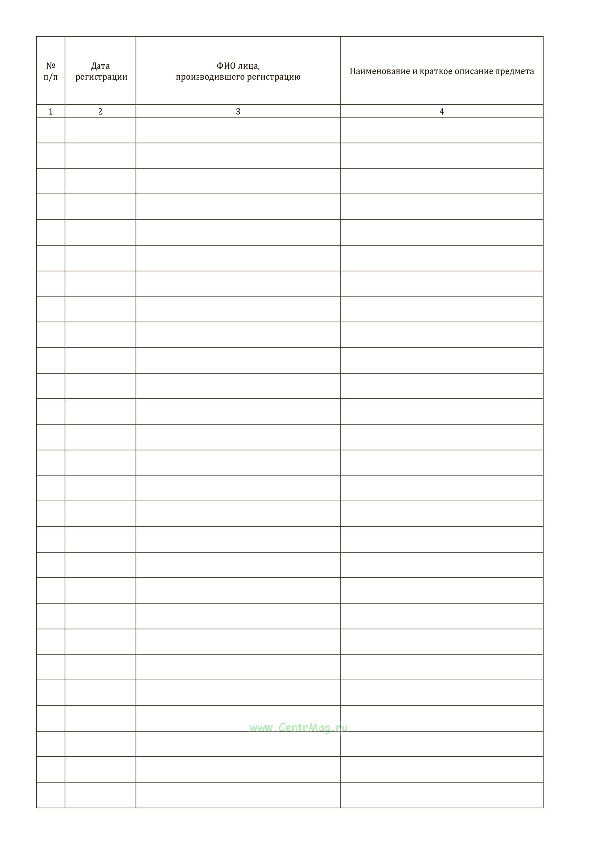 Книга применяется для регистрации принятых на временное хранение предметов, учета их количества и состояния, определения ответственного хранителя, сроков использования и контроля их последующего возврата или движения.