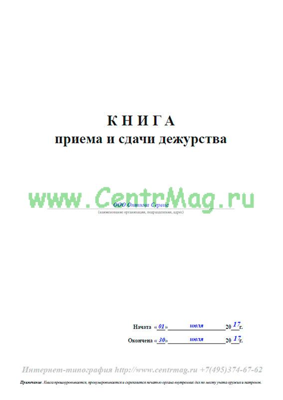 Форма книги приема и сдачи дежурства соответствует Приложению № 63 к Инструкции по организации работы органов внутренних дел по контролю за оборотом гражданского и служебного оружия и патронов к нему на территории Российской Федерации, но подходит и для других ведомств.