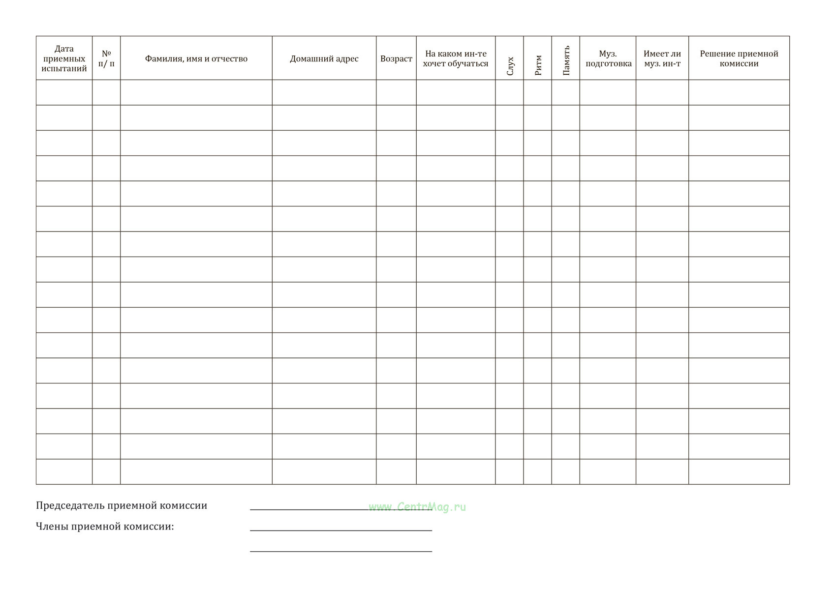 Книга применяется для фиксации результатов вступительных испытаний, оценки музыкальных способностей поступающих, анализа их подготовки и оформления решений приемной комиссии о зачислении.