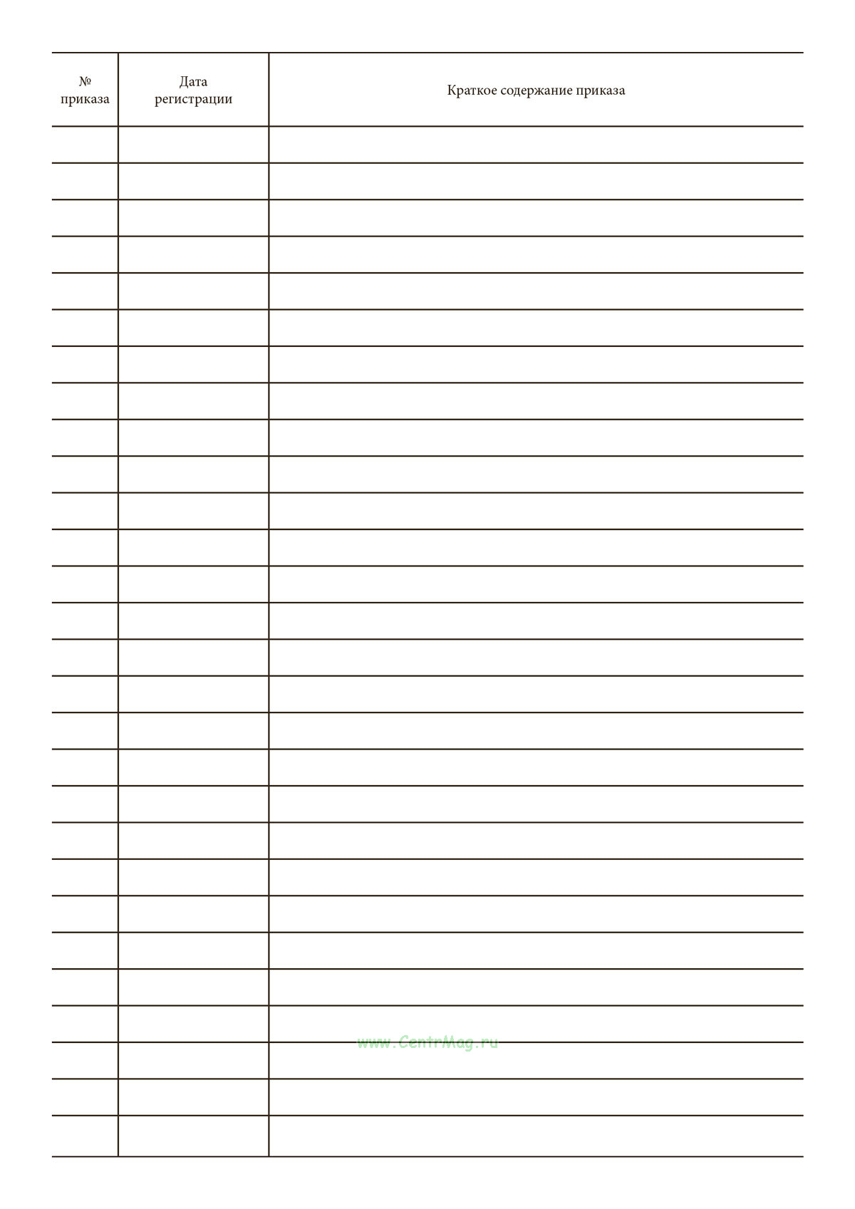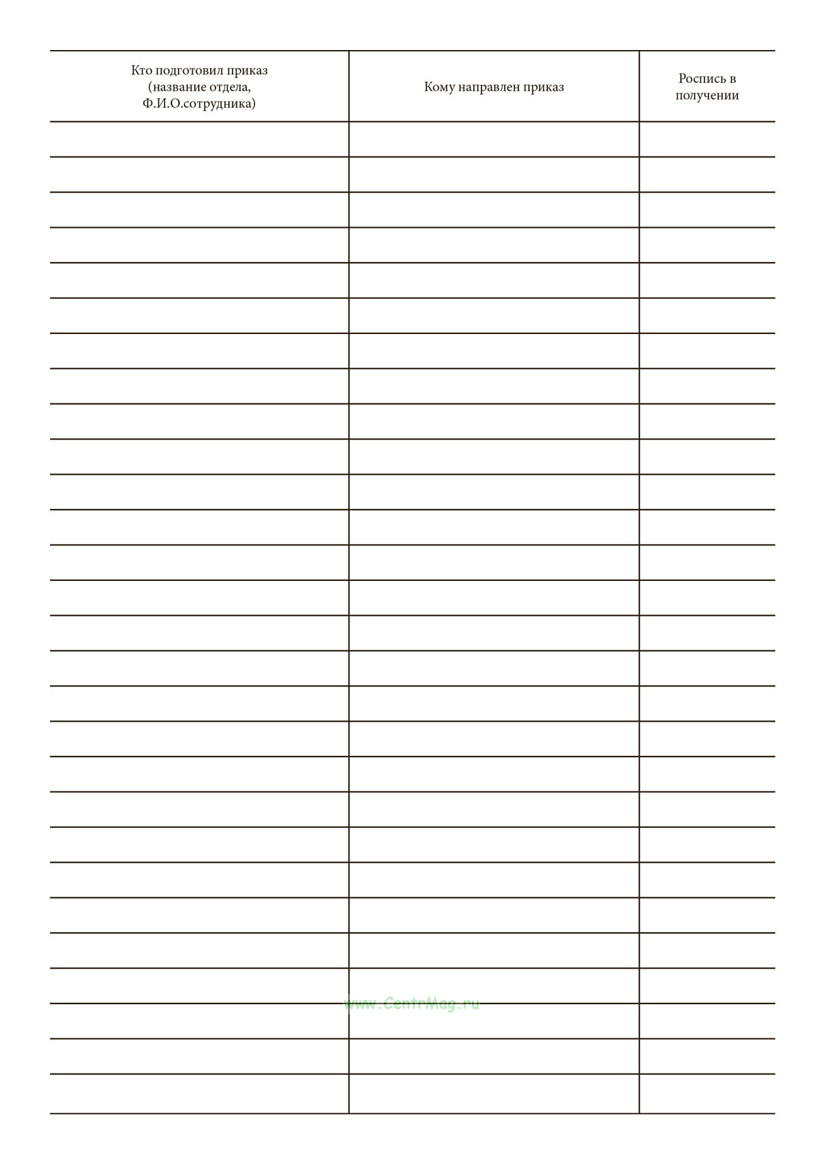 Книга применяется для учета и систематизации издаваемых в организации приказов, контроля их регистрации, доведения до исполнителей и подтверждения получения.