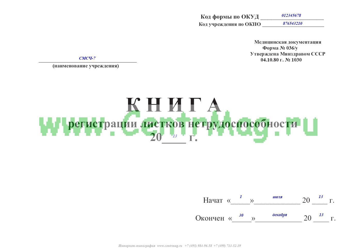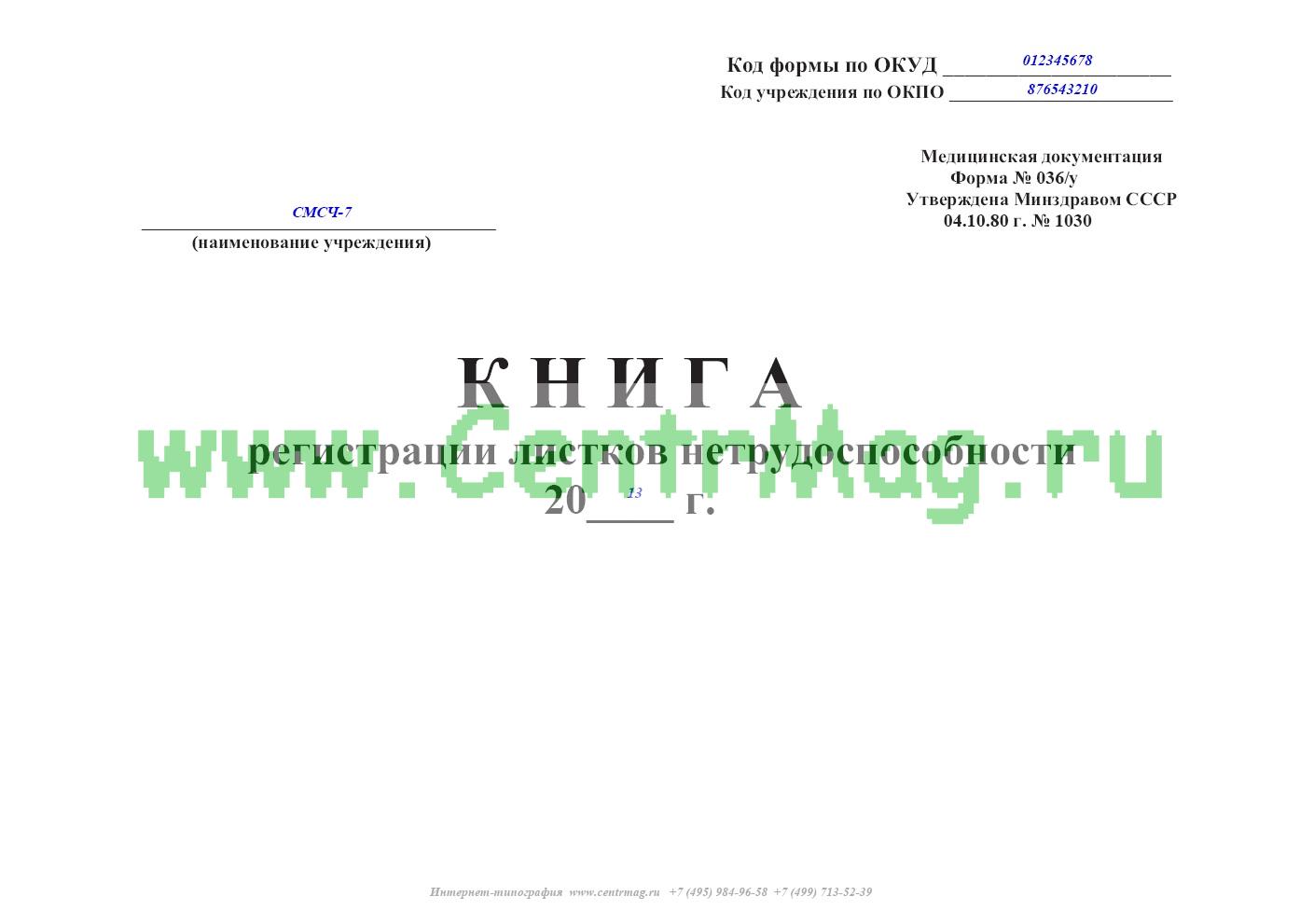 Книга регистрации листков нетрудоспособности форма 036/у, утверждена Приказом Минздрава СССР №1030 «Об утверждении форм первичной медицинской документации учреждений здравоохранения» от 4 октября 1980 г., который утратил силу.