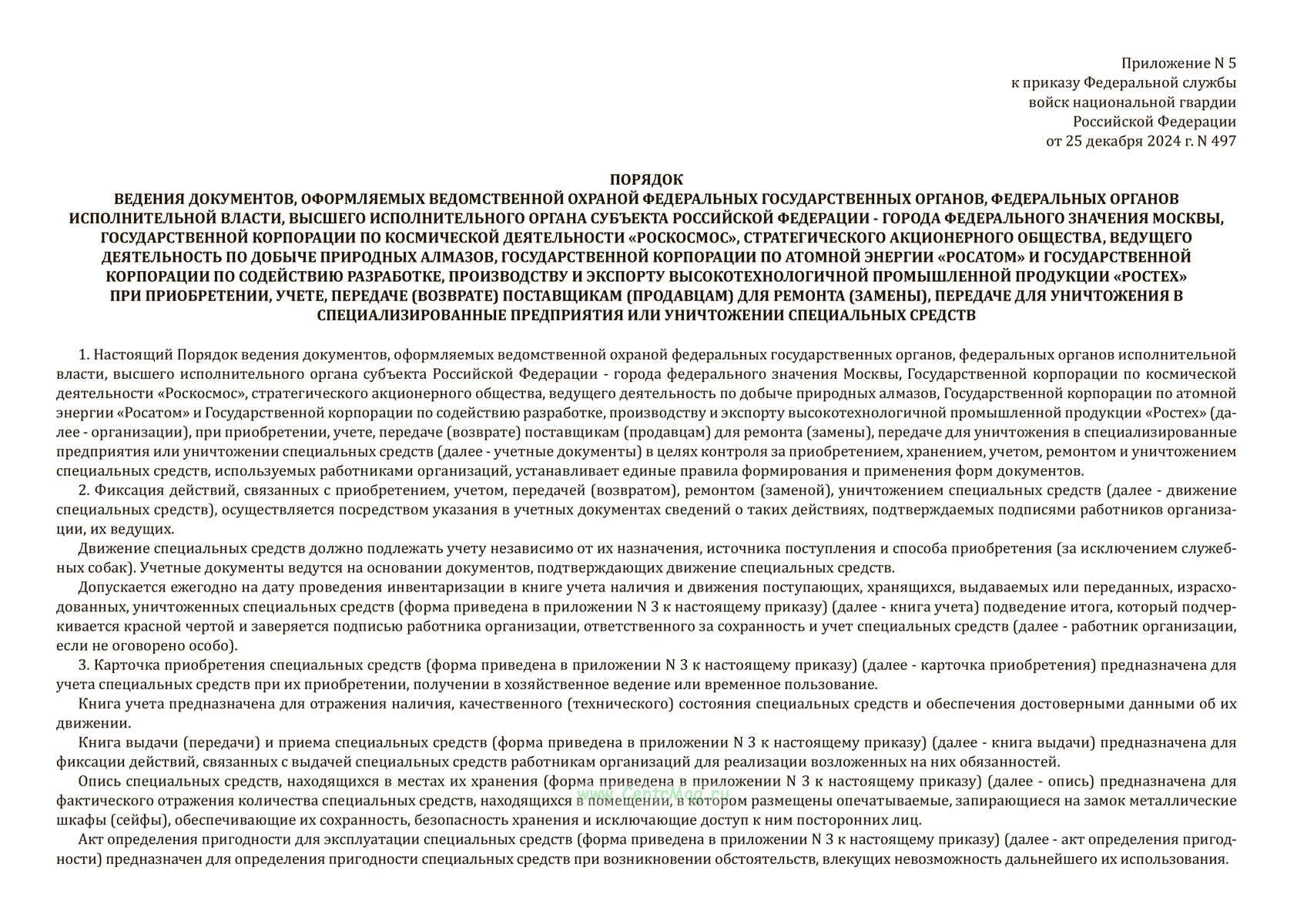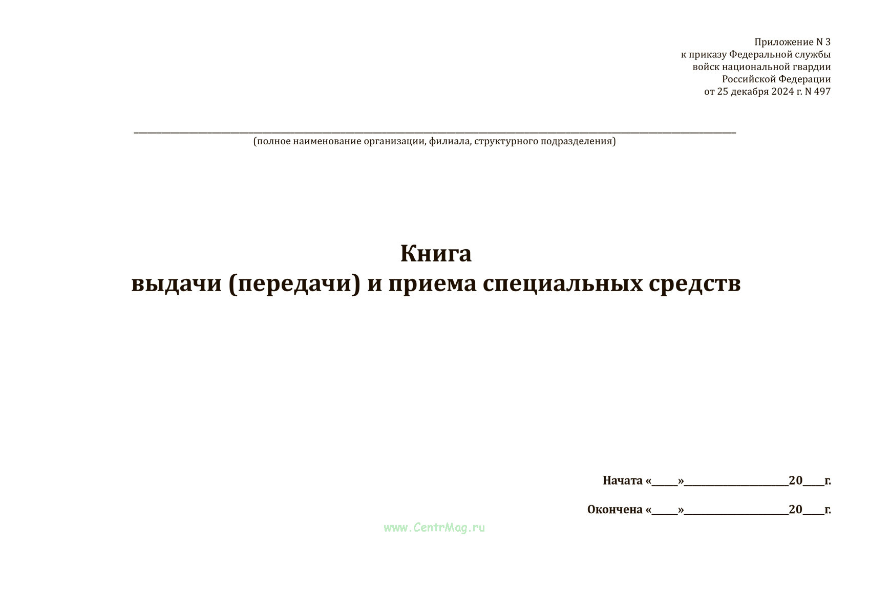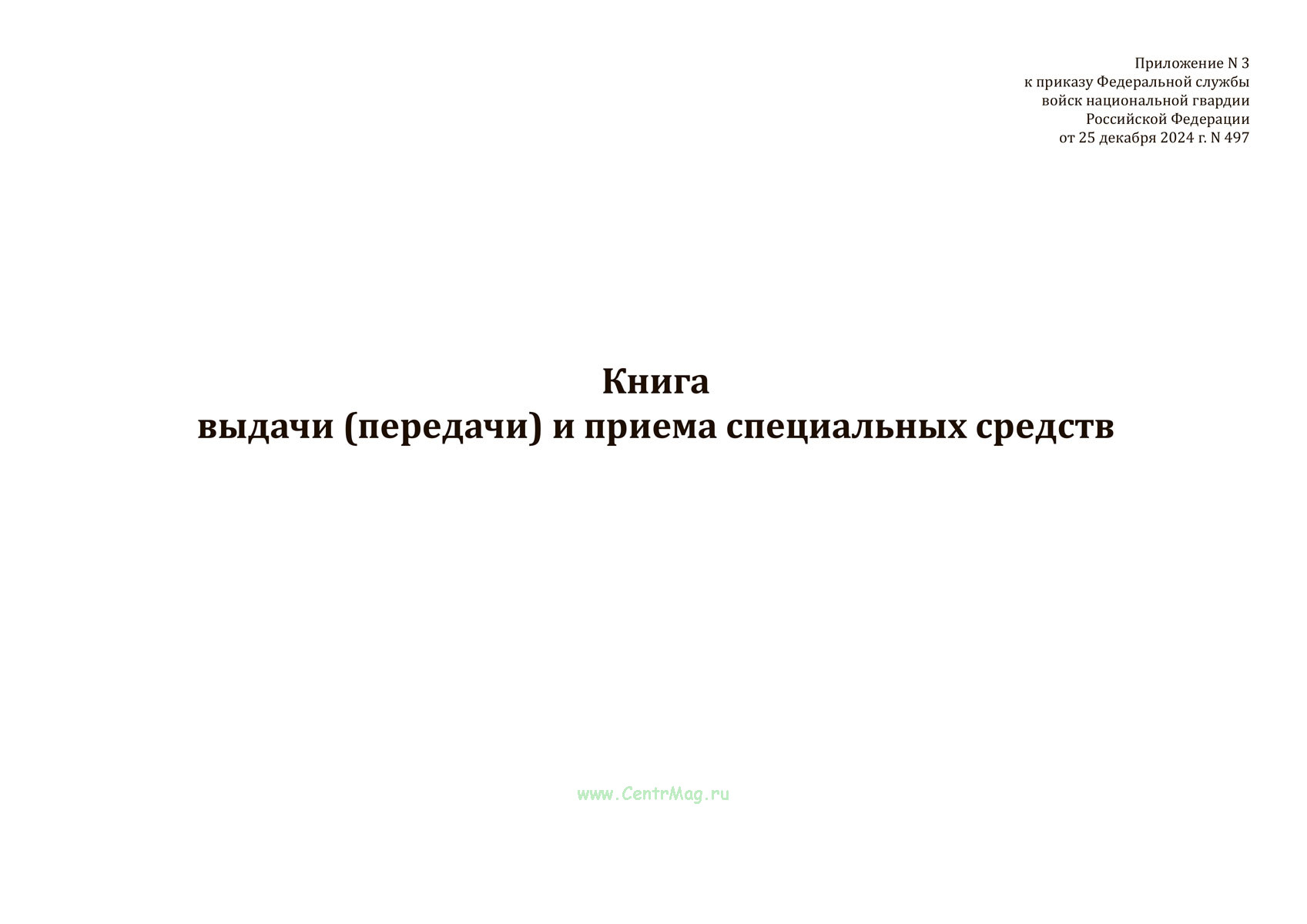 Форма Книги выдачи (передачи) и приема специальных средств соответствует Приложению № 3 к Приказу Росгвардии от 25.12.2024 N 497 "Об утверждении перечней, форм и порядков ведения документов, оформляемых ведомственной охраной федеральных государственных органов, федеральных органов исполнительной власти, высшего исполнительного органа субъекта Российской Федерации - города федерального значения Москвы, организаций, имеющих в соответствии с законодательством Российской Федерации право на создание ведомственной охраны, при приобретении, учете, передаче (возврате) специальных средств, а также публичным акционерным обществом "Сбербанк России" при передаче специальных средств"