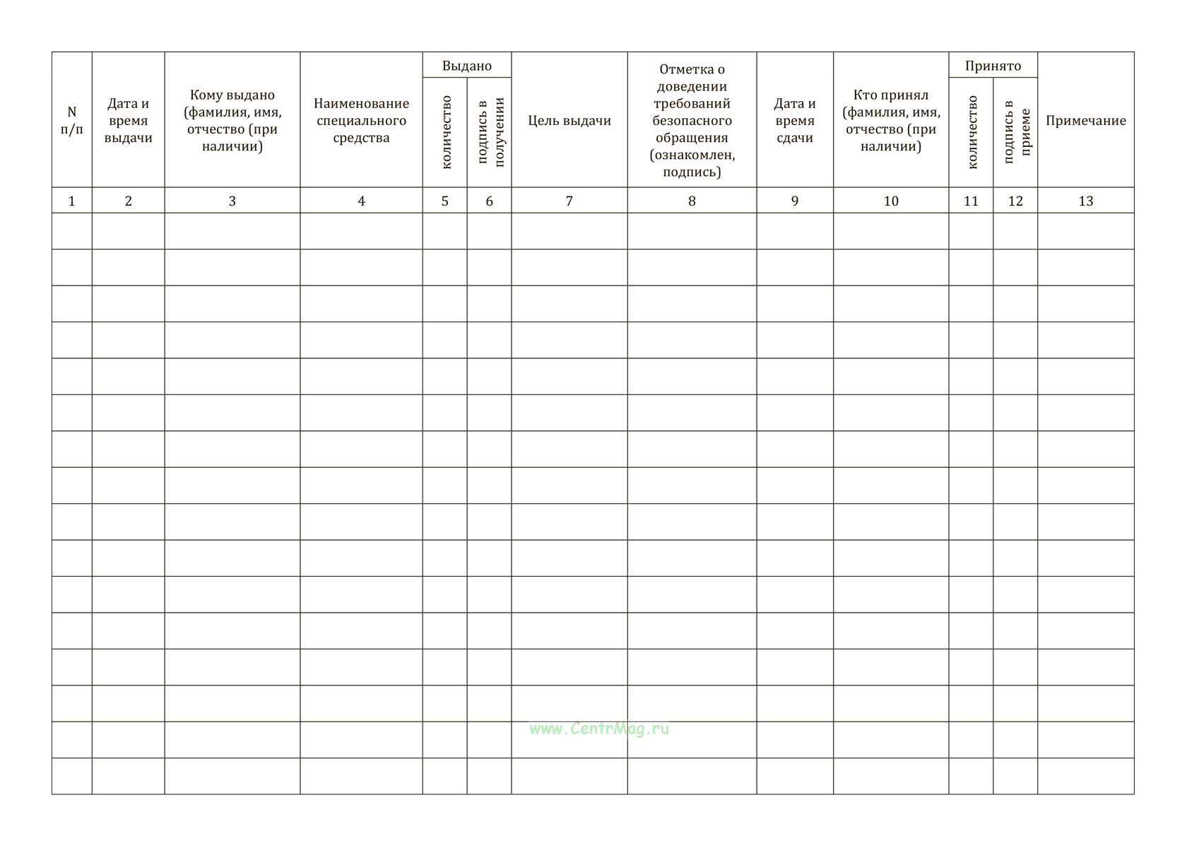 Книга выдачи (передачи) и приема специальных средств имеет графы: