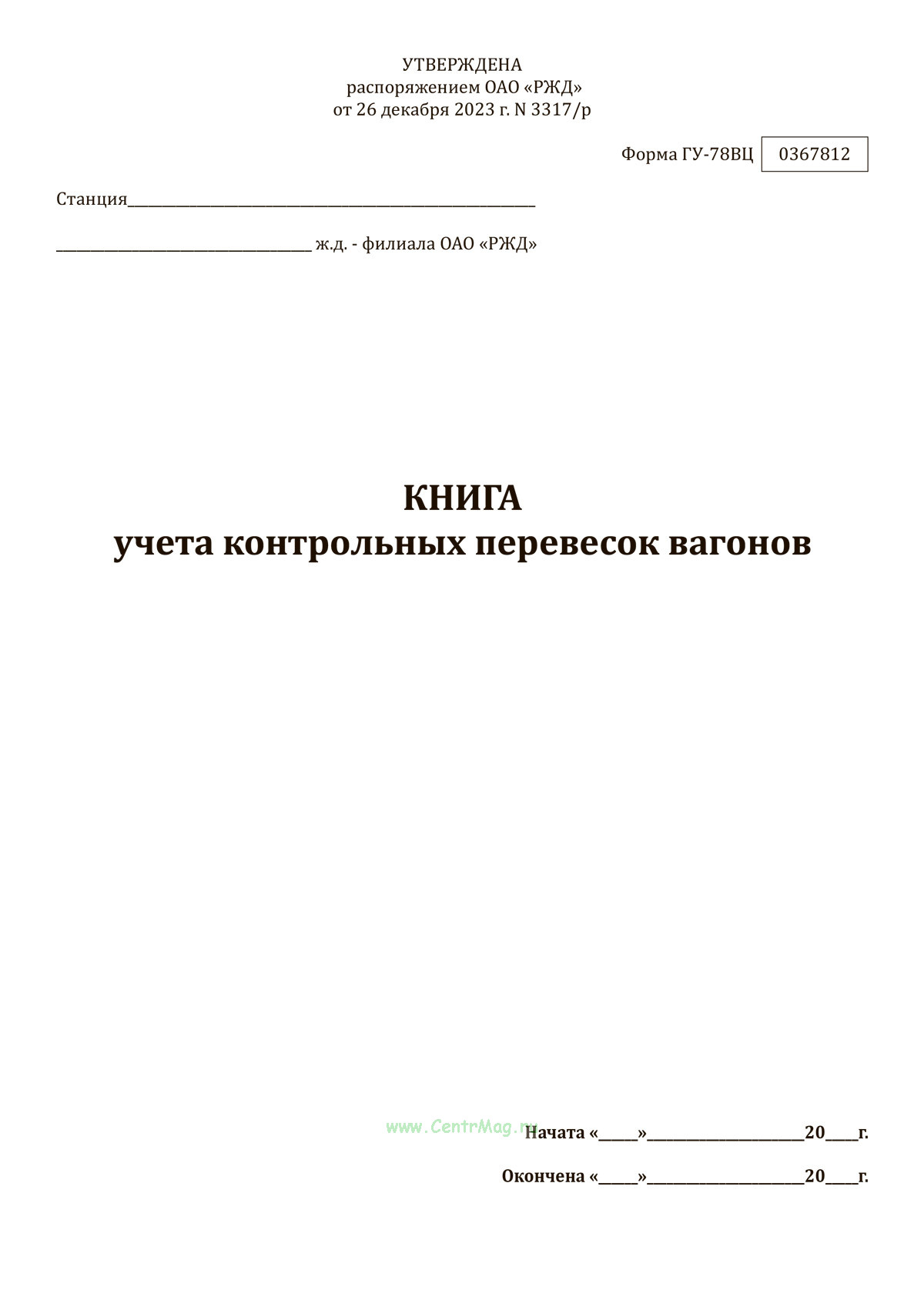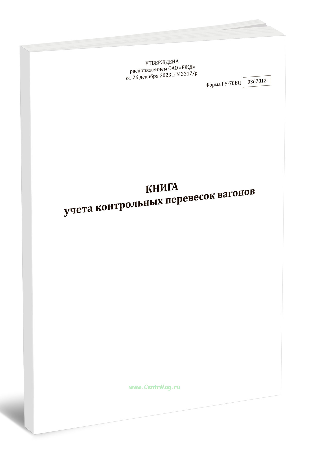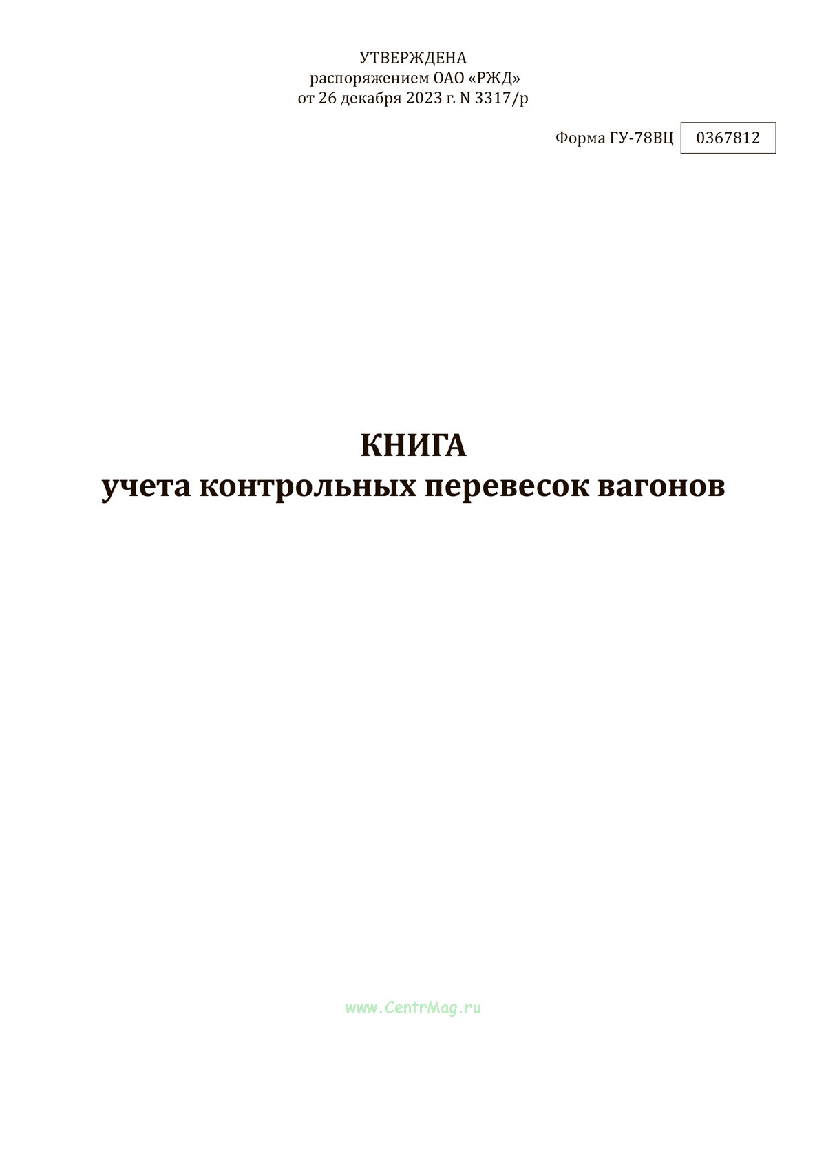 Форма Книги учета контрольных перевесок вагонов (ГУ-78ВЦ) утверждена Распоряжением ОАО "РЖД" от 26.12.2023 N 3317/р