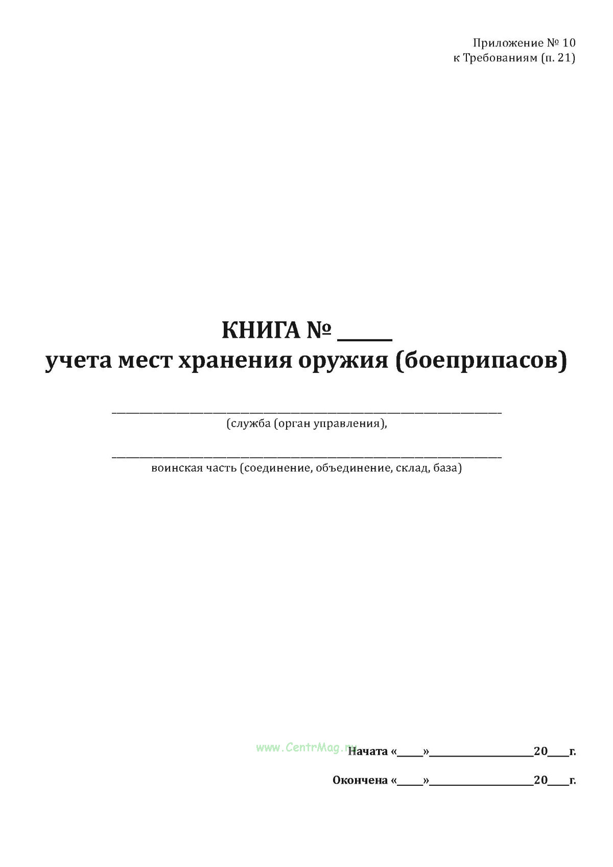 Форма Книги учета мест хранения оружия (боеприпасов) соответствует Приложению 10 к N 299 Приказу Министра обороны РФ от 8 июля 2020 г. N 299 .