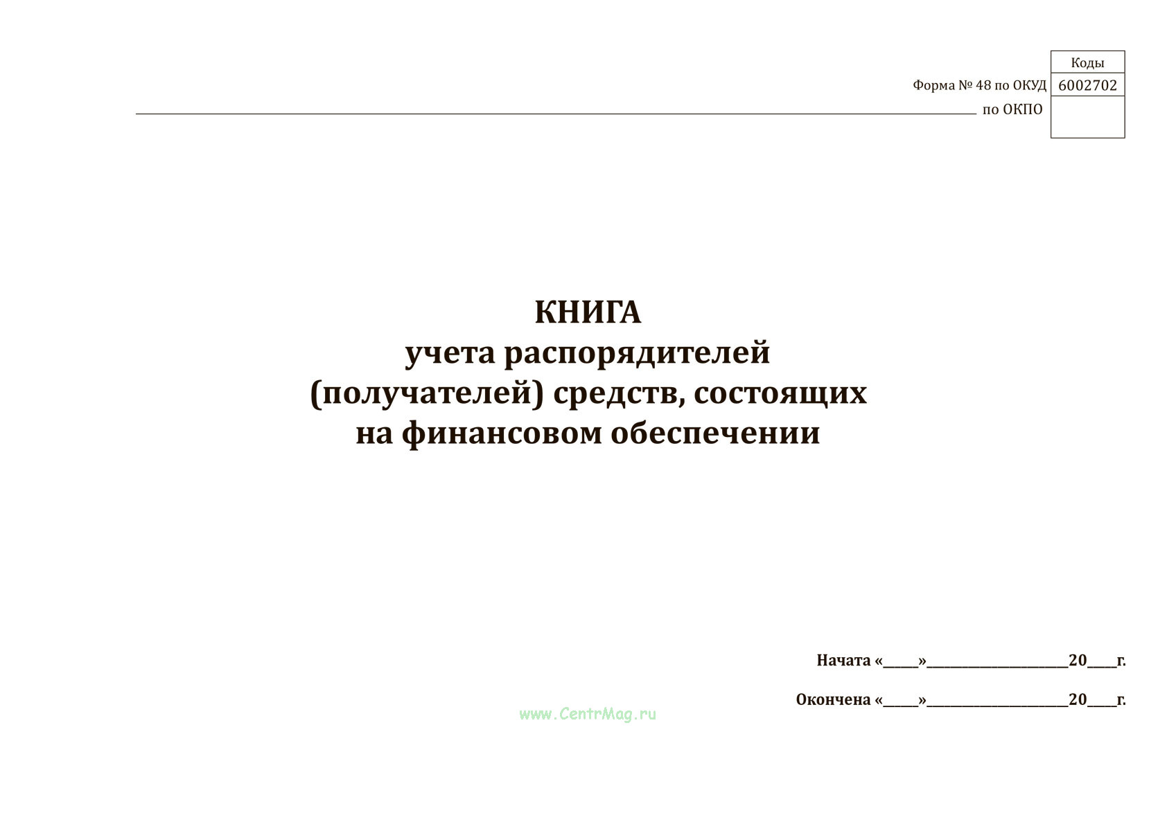 Форма Книги учета распорядителей (получателей) средств, состоящих на финансовом обеспечении (Форма N 48) ОКУД 6002702 входит в список Форм документов, используемых в финансово-хозяйственной деятельности Вооруженных Сил Российской Федерации, согласно Приказу от 28 марта 2008 г. N 139.