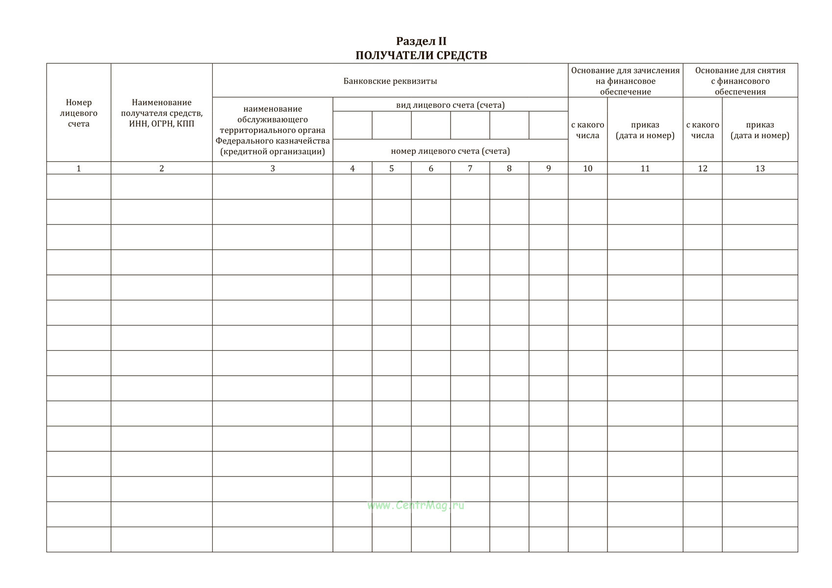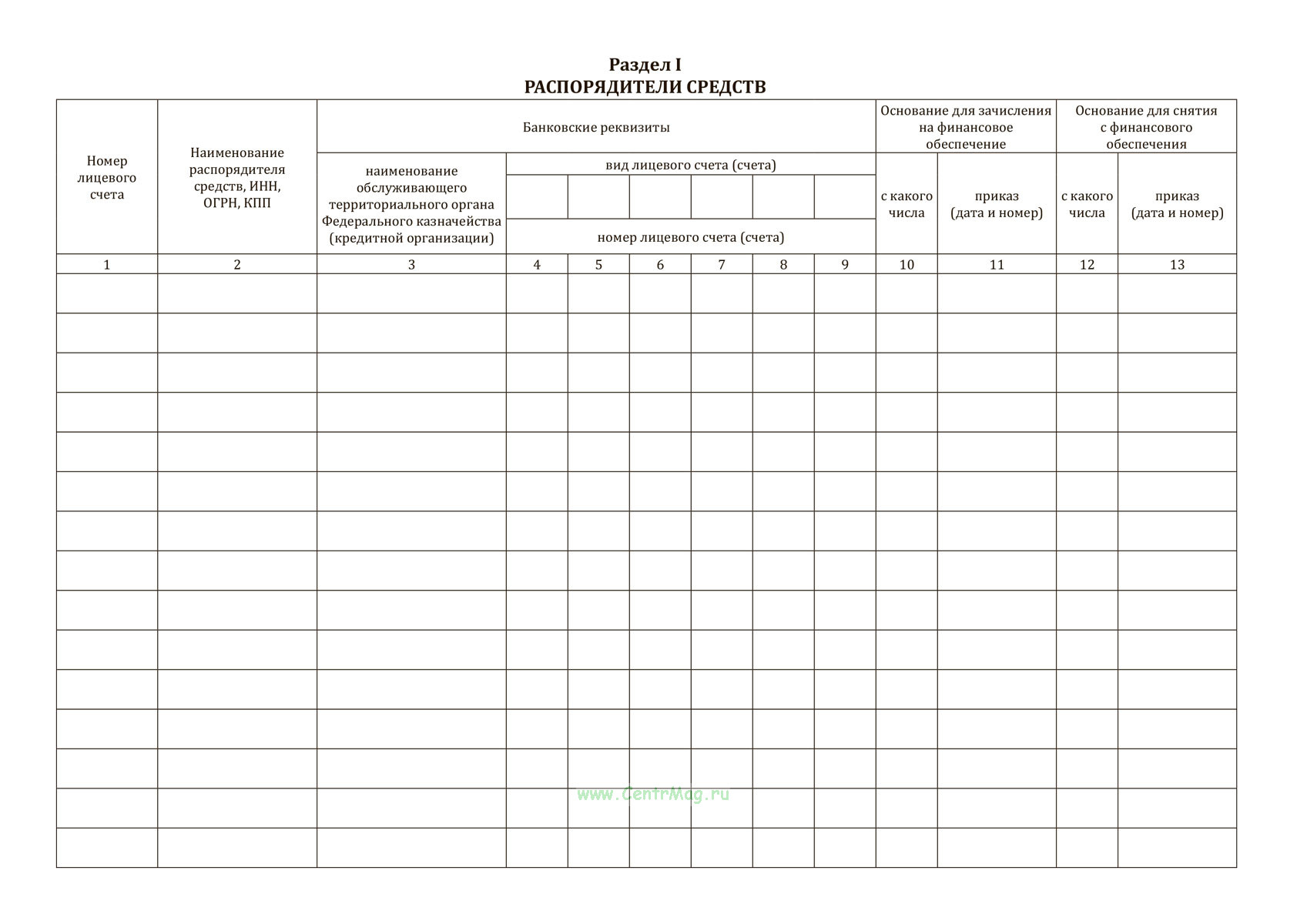В книге открываются два раздела: раздел I - для учета распорядителей и раздел II - для учета получателей средств.
