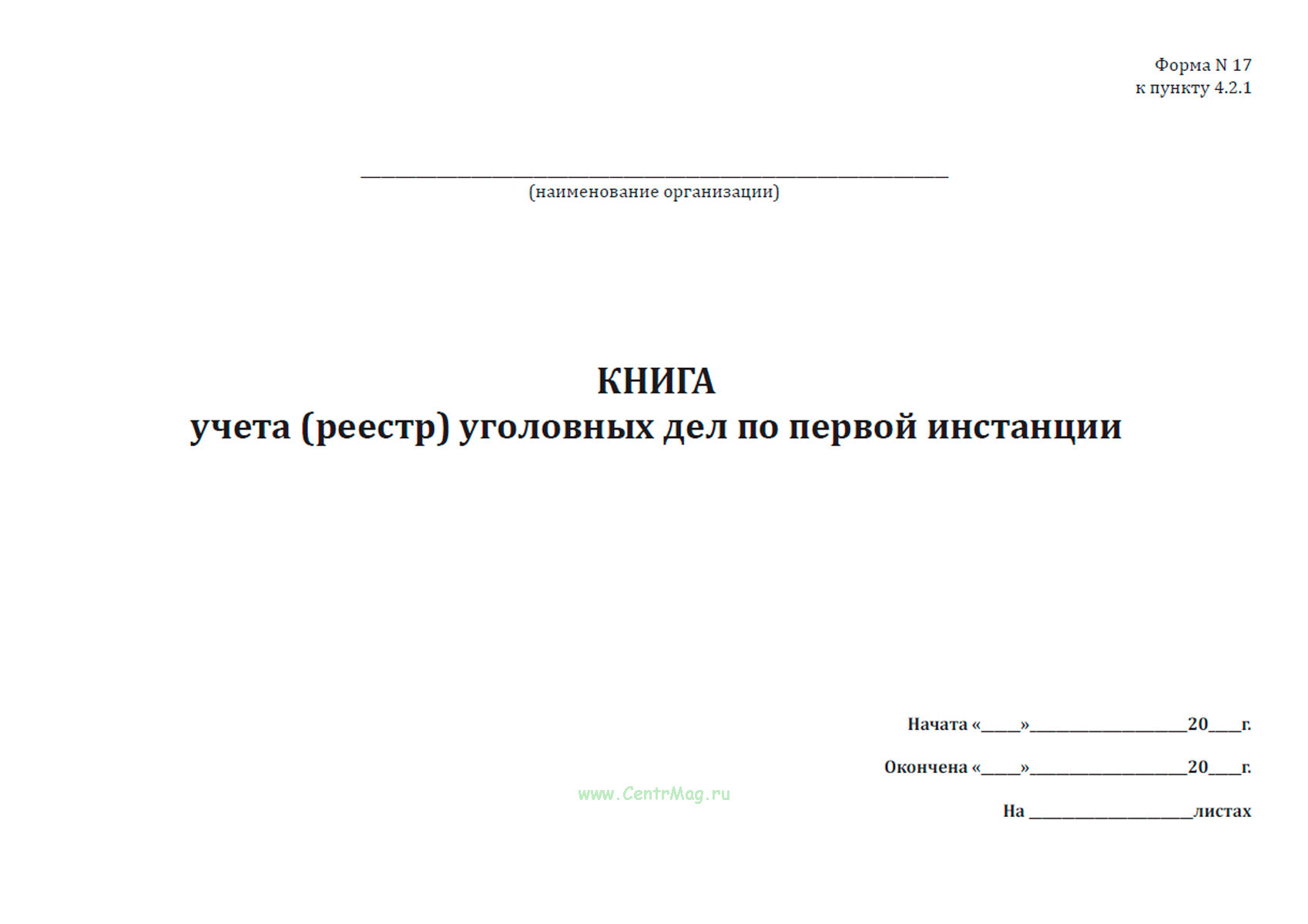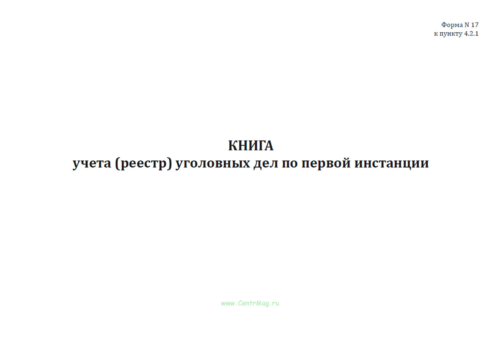 Форма Книги учета (реестр) уголовных дел по первой инстанции (N 17) соответствует Приложению N 2 к Приказу Судебного департамента при Верховном Суде РФ от 09.10.2014 N 219 "Об утверждении Инструкции по делопроизводству в военных судах".