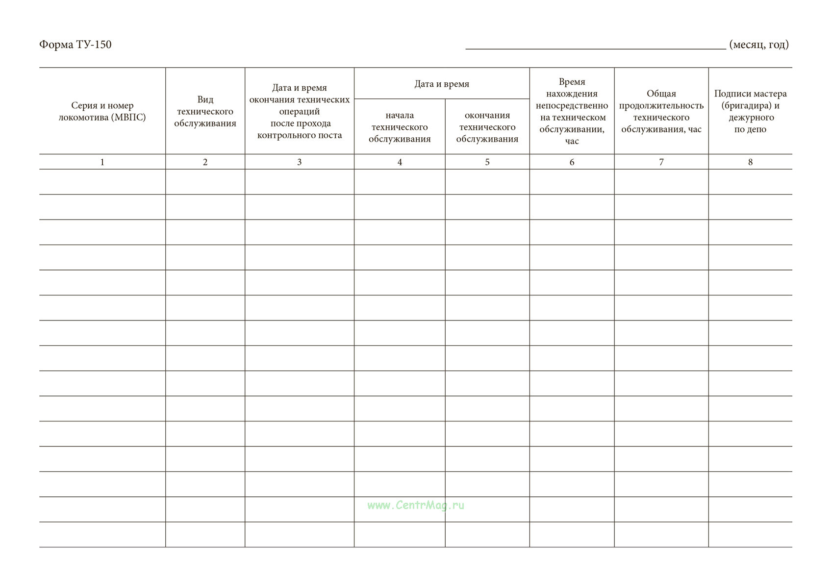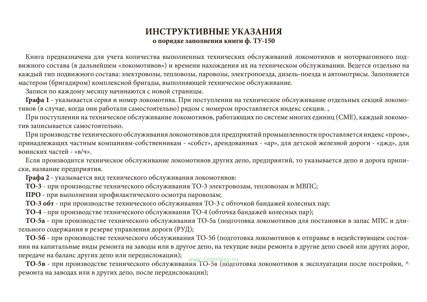 Порядок заполнения книги ф. ТУ-150 приведен в Инструктивных указания о порядке составления учетных форм по локомотивному хозяйству. МПС РФ, № ЦЧУЛ-68 от 30.09.1999.