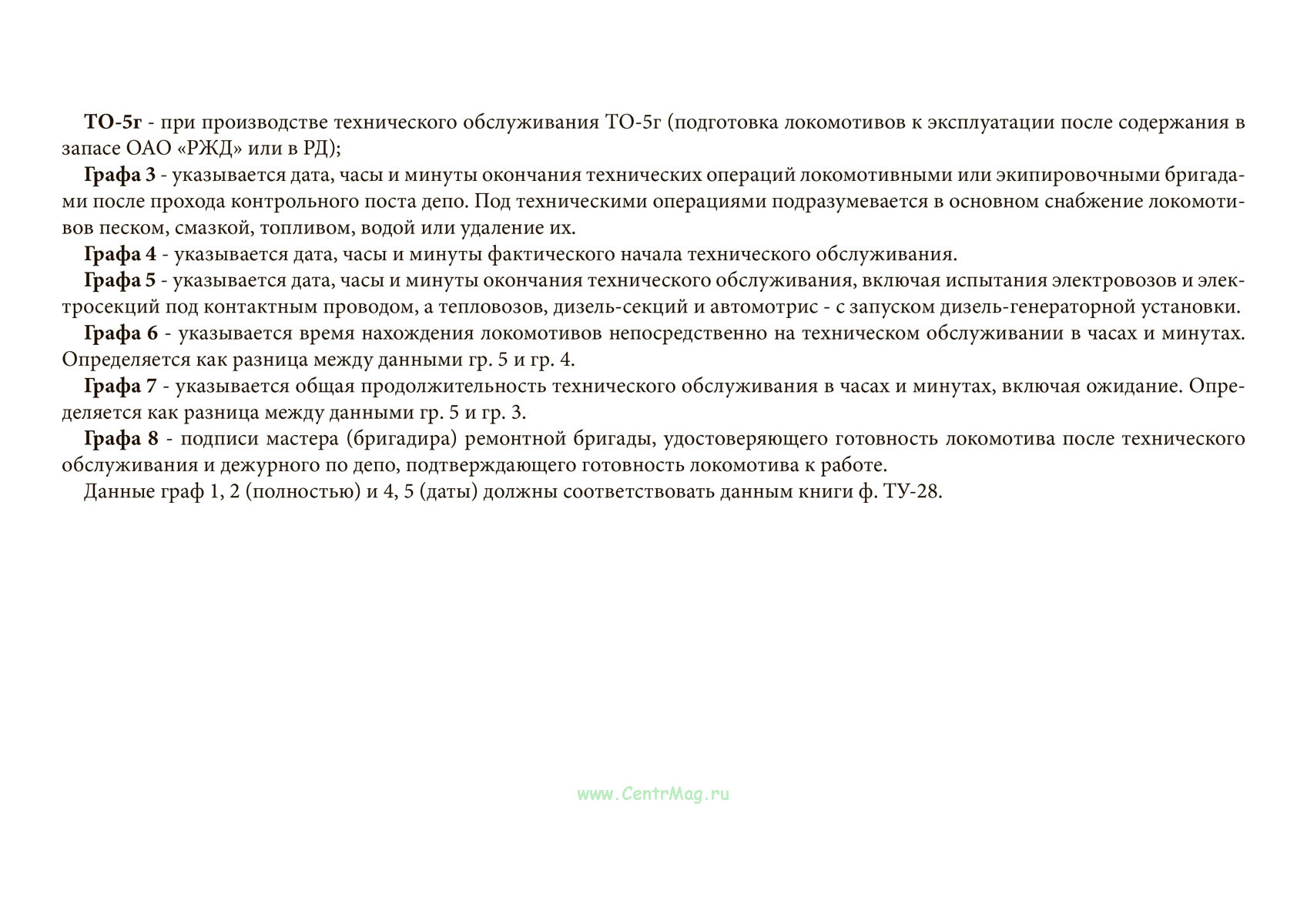 ТО-5г - при производстве технического обслуживания ТО-5г (подготовка локомотивов к эксплуатации после содержания в запасе ОАО «РЖД» или в РД);