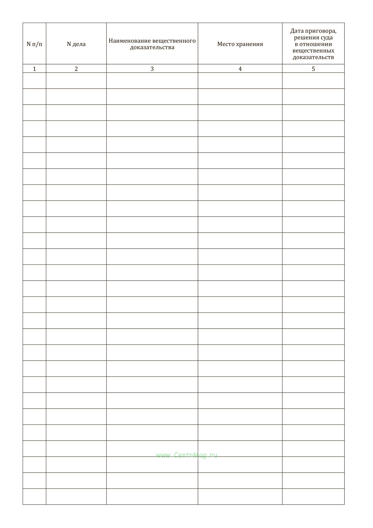 Книга учета вещественных доказательств, находящихся вне камеры хранения суда (Форма N 80.1) имеет графы: