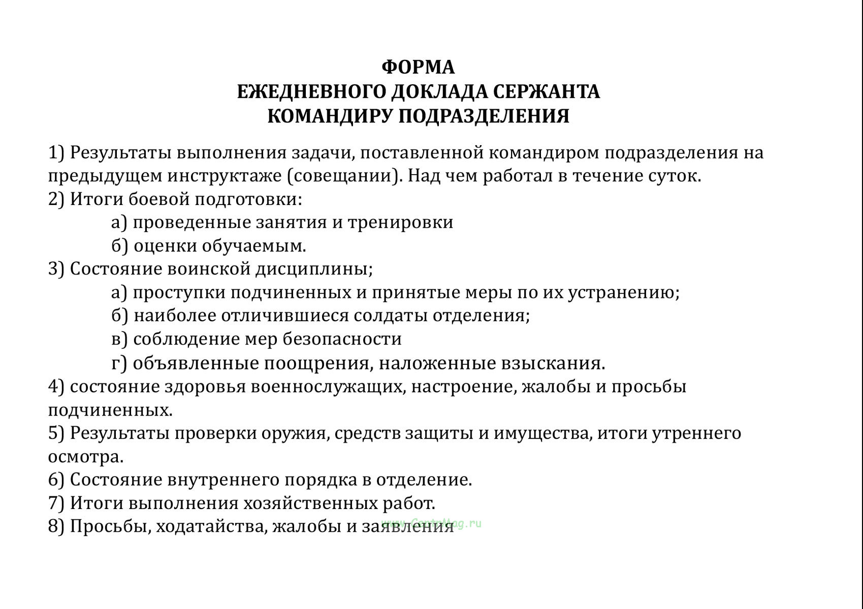 В книжке приведена форма ежедневного доклада сержанта командиру подразделения, основные положения строевого и дисциплинарного Устава ВС РФ, дана памятка по оказанию первой помощи.