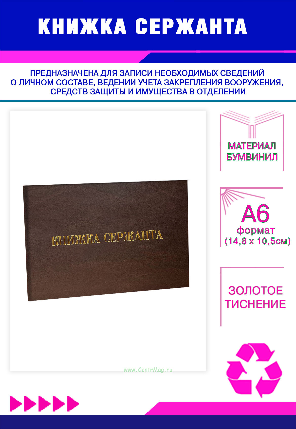 Книжка сержанта предназначена для записи необходимых сведений о личном составе, ведении учета закрепления вооружения, средств защиты и имущества в отделении.