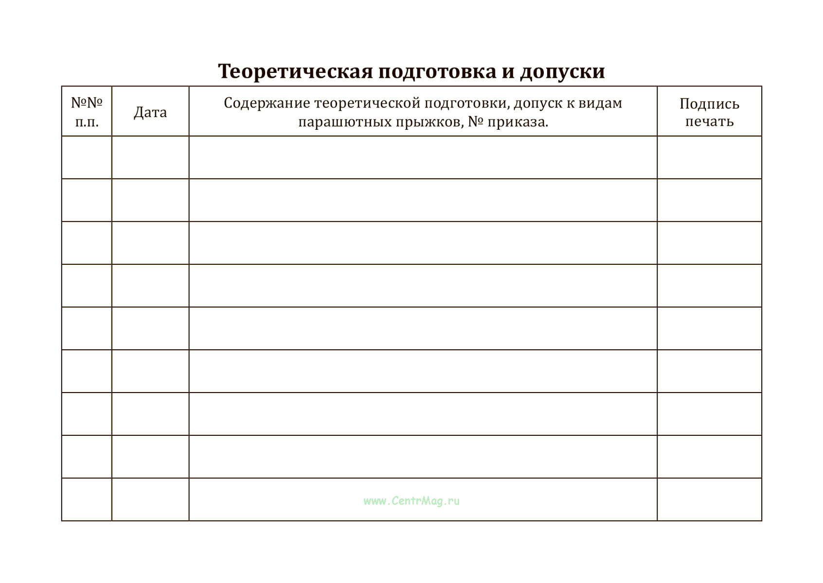 Компактная книжка парашютиста для фиксации каждого прыжка и результатов подготовки. Твердая обложка из износостойкого бумвинила защищает блок и аккуратно выглядит на брифинге и в укладочной. Внутри - продуманные формы на русском языке: персональные данные с местом для фото 3х4, "Общие сведения" (разряды, сертификаты A–D, удостоверения), большой журнал прыжков и раздел "Теоретическая подготовка и допуски". Таблицы включают ключевые графы: № прыжка, дата, тип ЛА, тип парашютной системы, высота отделения, время свободного падения, № упражнения, место выполнения и подпись инструктора. Приведена сводная таблица упражнений по СПП-2010 / КПП-2003 для удобства контроля прогресса. Удобный формат А6 позволяет носить книжку с собой и быстро заполнять записи после приземления.