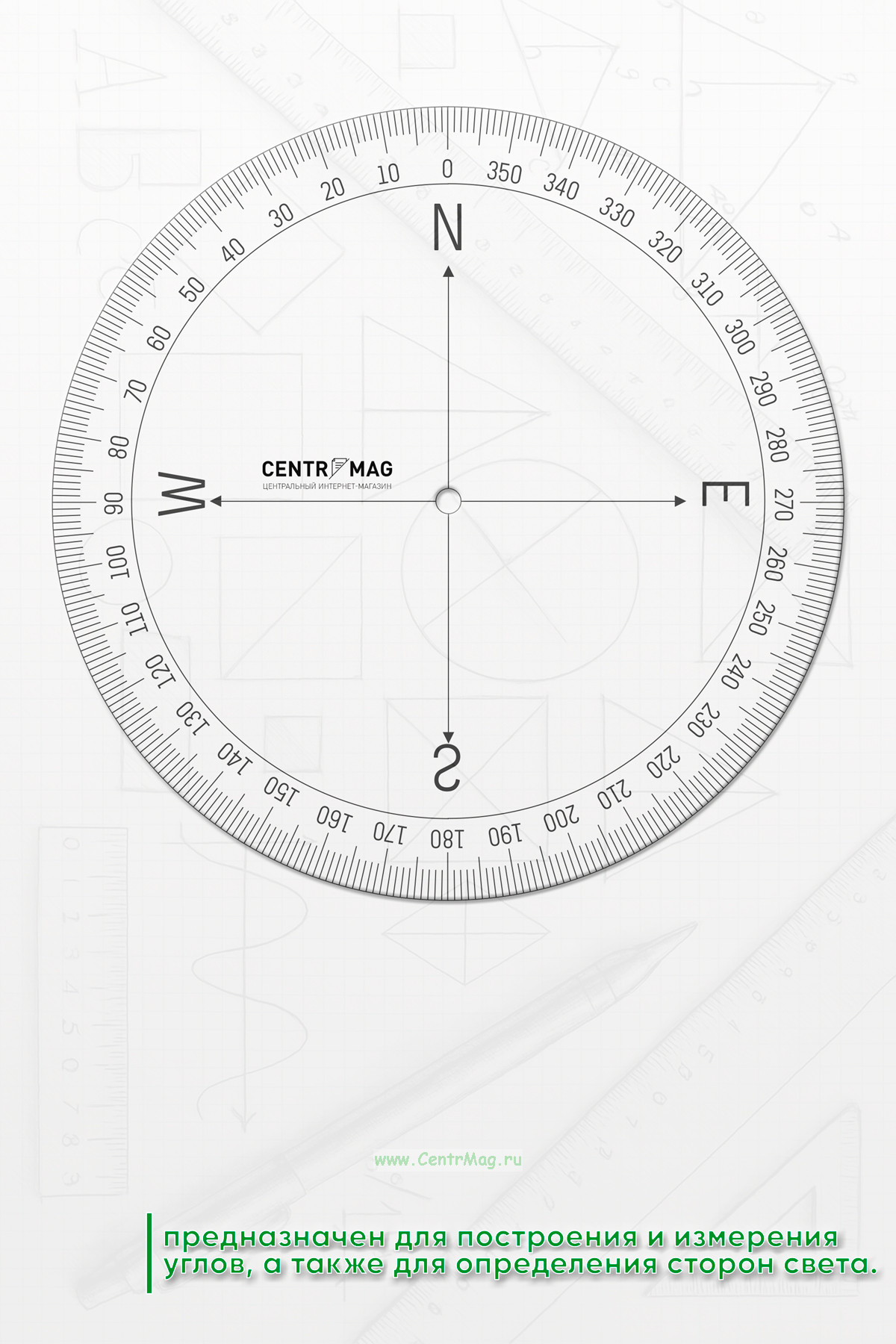 Компас-транспортир предназначен для построения и измерения углов, а также для определения сторон света.