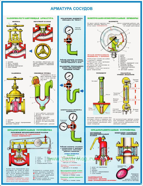 Плакат посвящен видам запорно-регулирующей, предохранительной и контрольно-измерительной арматуры. Подробно показаны манометры, термометры, предохранительные клапаны, вентили, задвижки, указатели уровня жидкости, а также их назначение, принцип работы и требования к установке и проверке.
