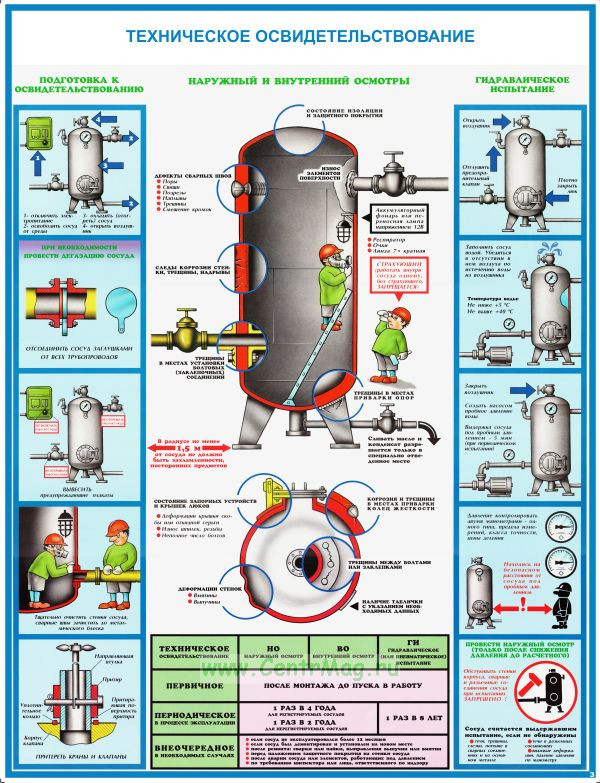 Плакат раскрывает порядок подготовки и проведения технического освидетельствования сосудов, включая наружный и внутренний осмотры, гидравлические испытания, периодичность проверок и условия допуска к эксплуатации. Наглядно показаны основные зоны контроля и типовые дефекты.