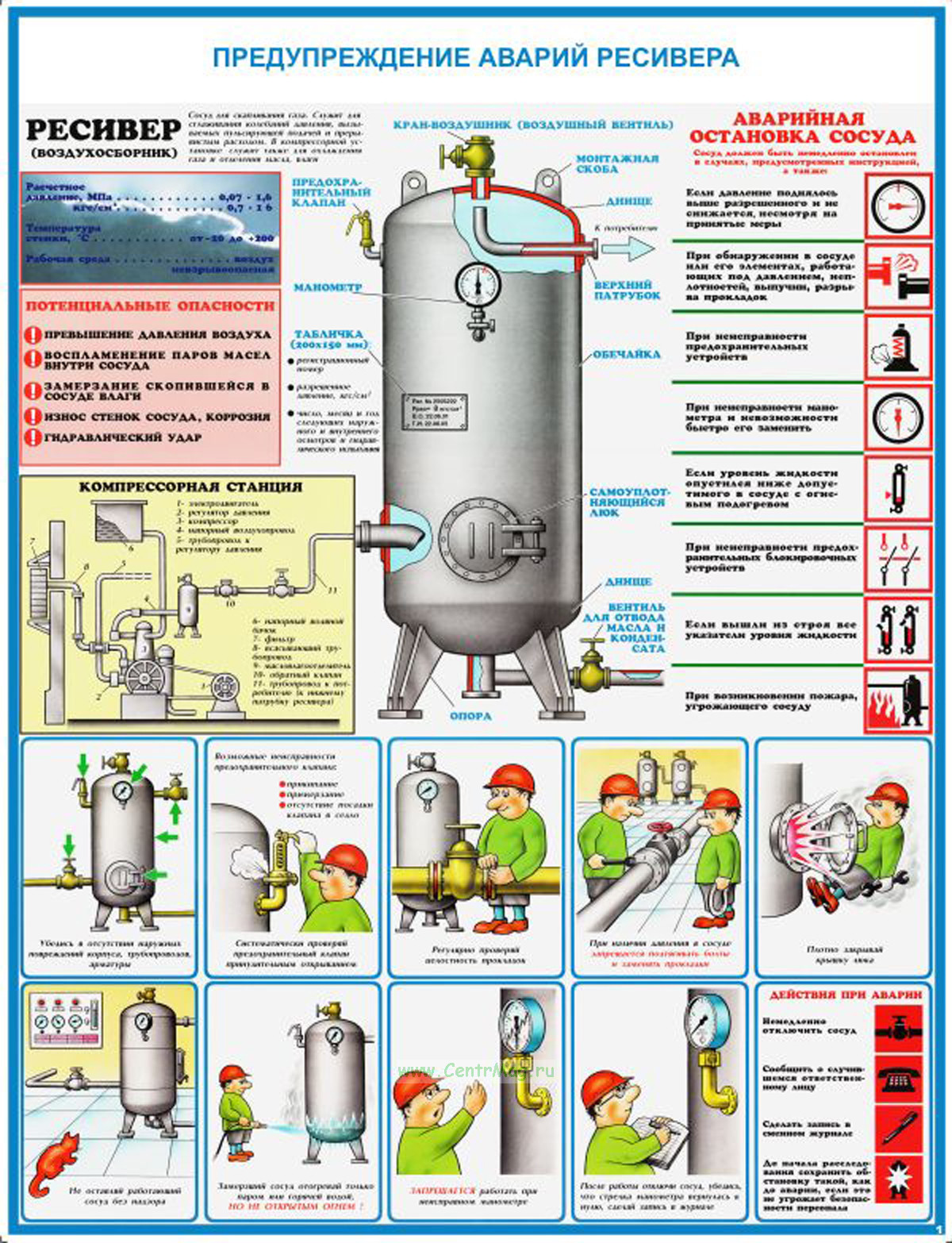 Плакат наглядно показывает устройство ресивера (воздухосборника), возможные опасности при эксплуатации, причины аварийных ситуаций и порядок действий персонала при нештатных режимах. Отражены потенциальные риски (превышение давления, коррозия, гидроудар и др.), правила аварийной остановки сосуда и требования к безопасной работе.