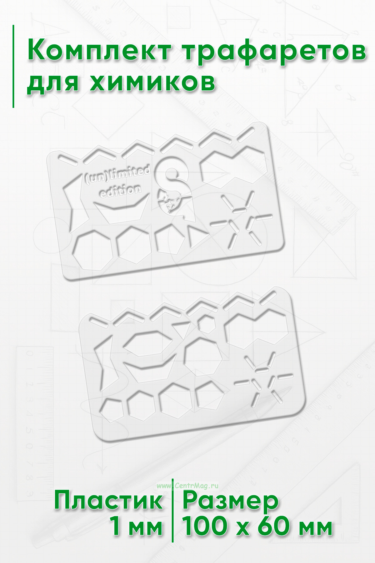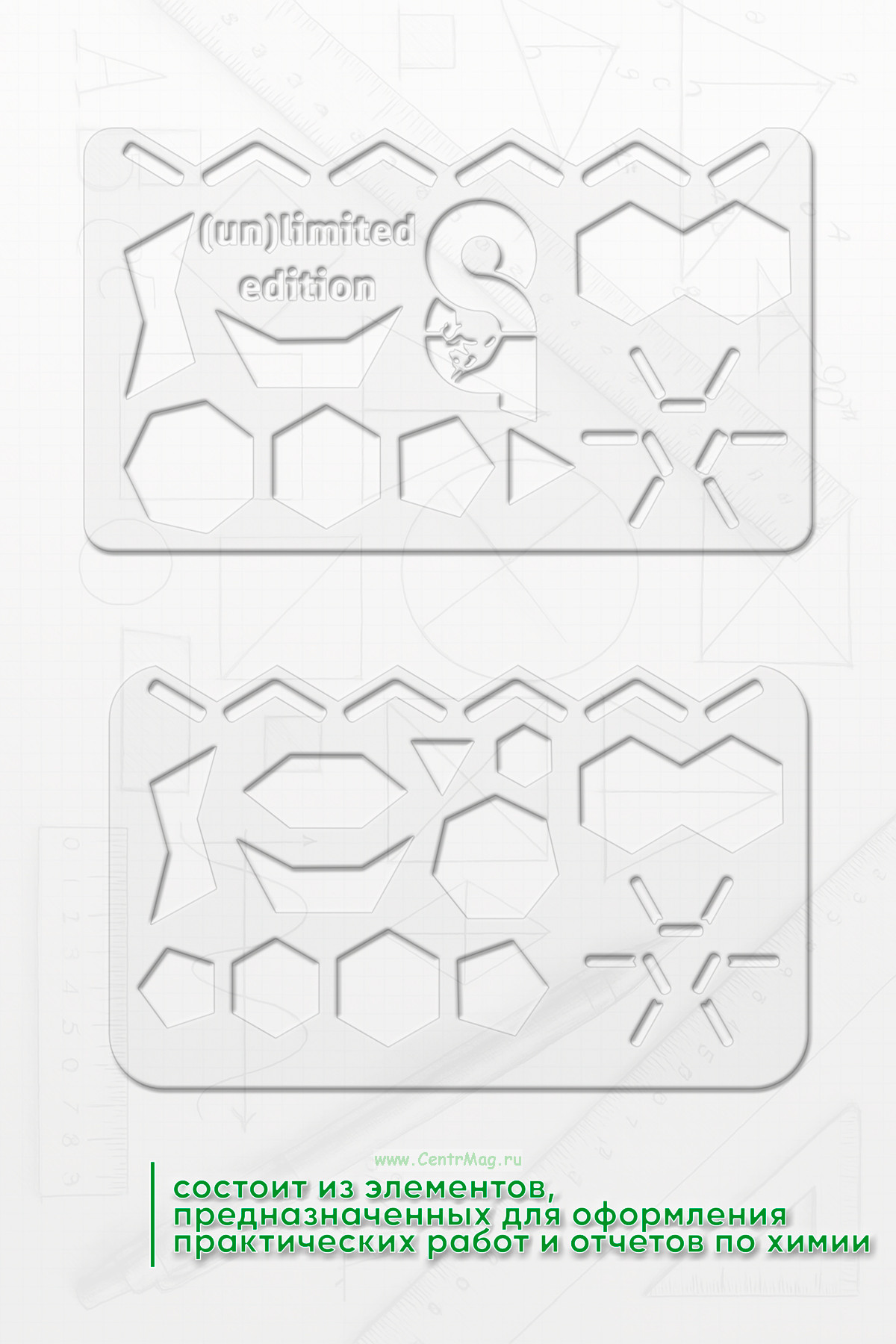 Набор состоит из двух линеек, на которых есть необходимое количество элементов, предназначенных для оформления практических работ и отчетов по химии