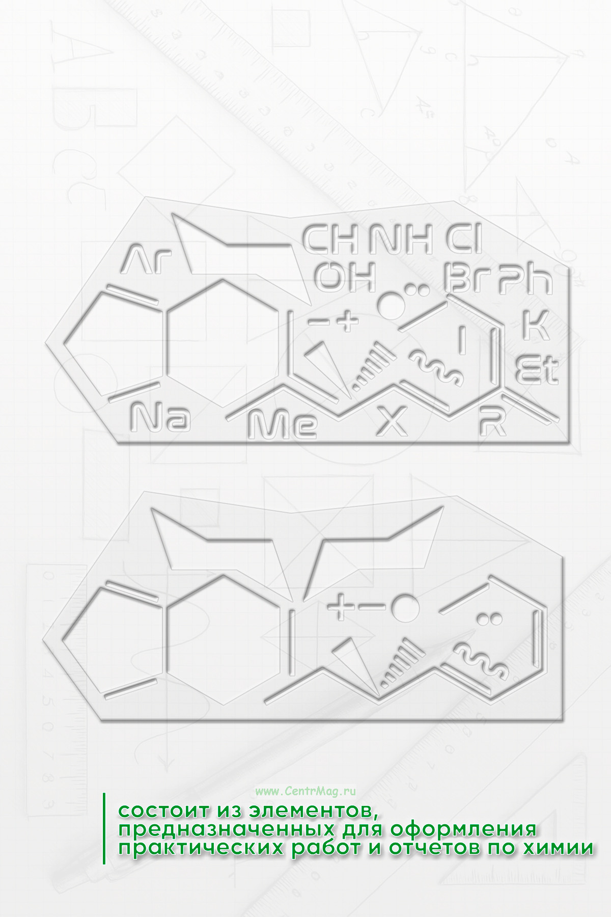 Набор состоит из двух линеек, на которых есть необходимое количество элементов, предназначенных для оформления практических работ и отчетов по химии