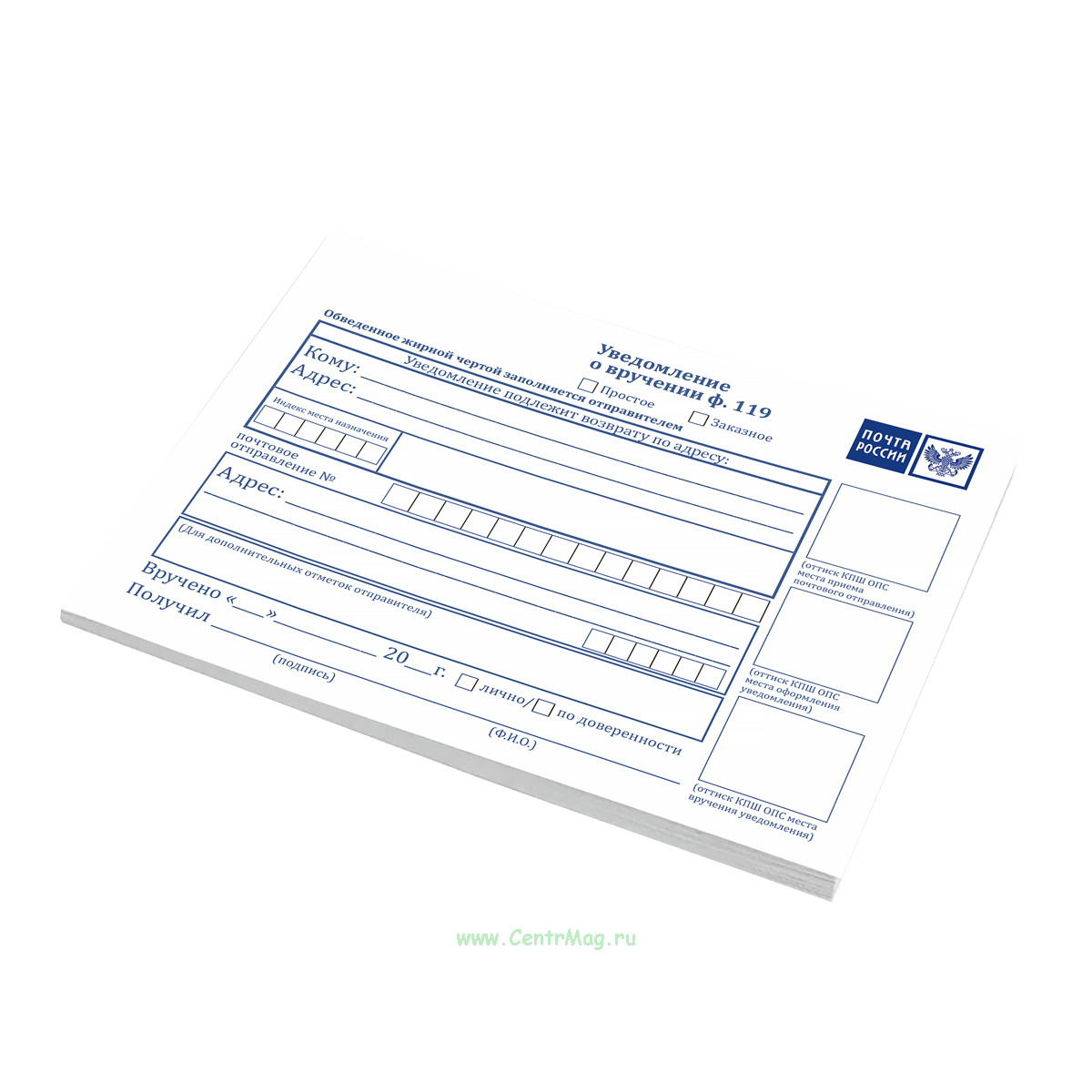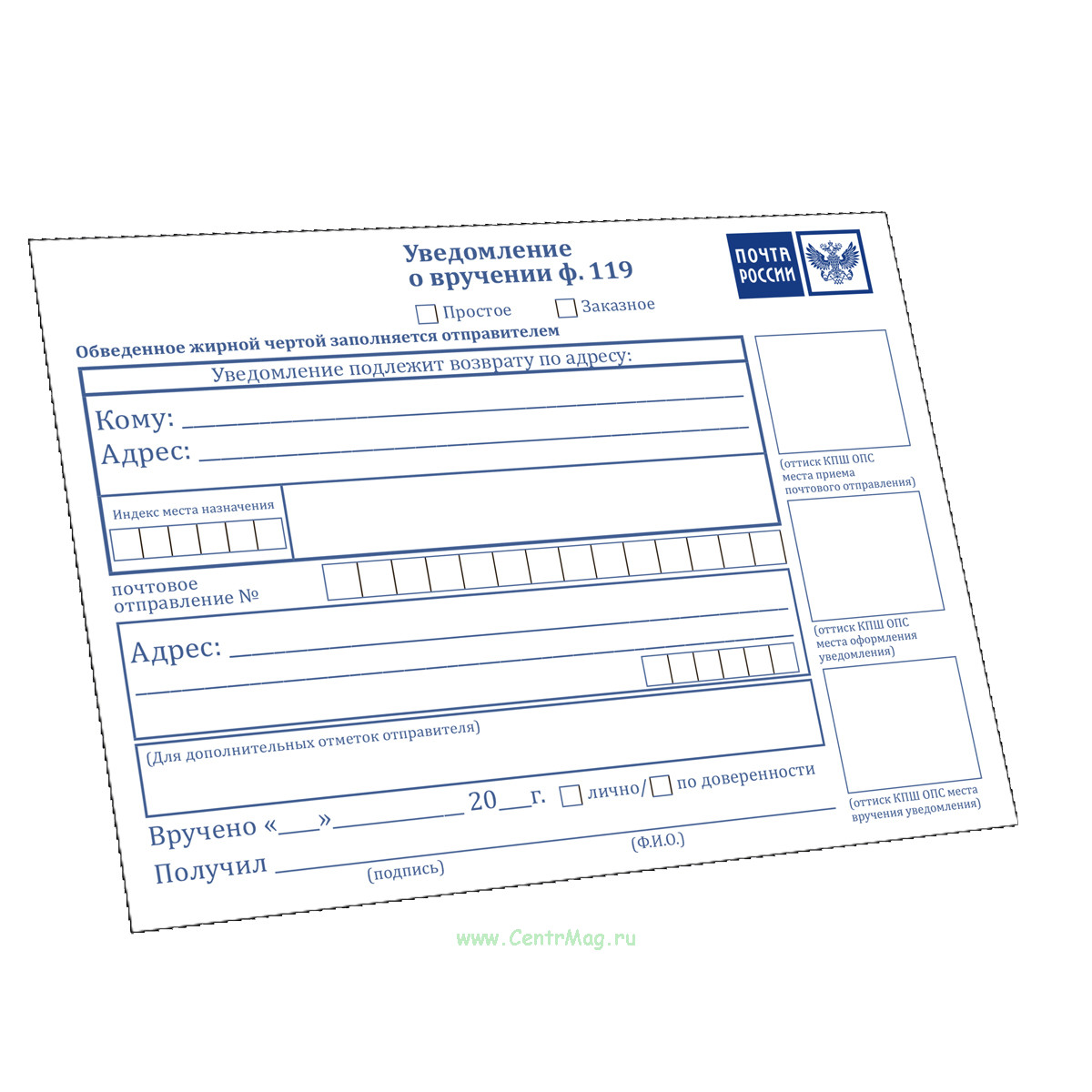 Уведомление о вручении ф. 119 - cамоклеящийся - это почтовый документ, предназначенный для того, чтобы информировать отправителя или другое указанное заинтересованное лицо, что почтовое отправление состоялось, и предмет отравления вручен получателю.