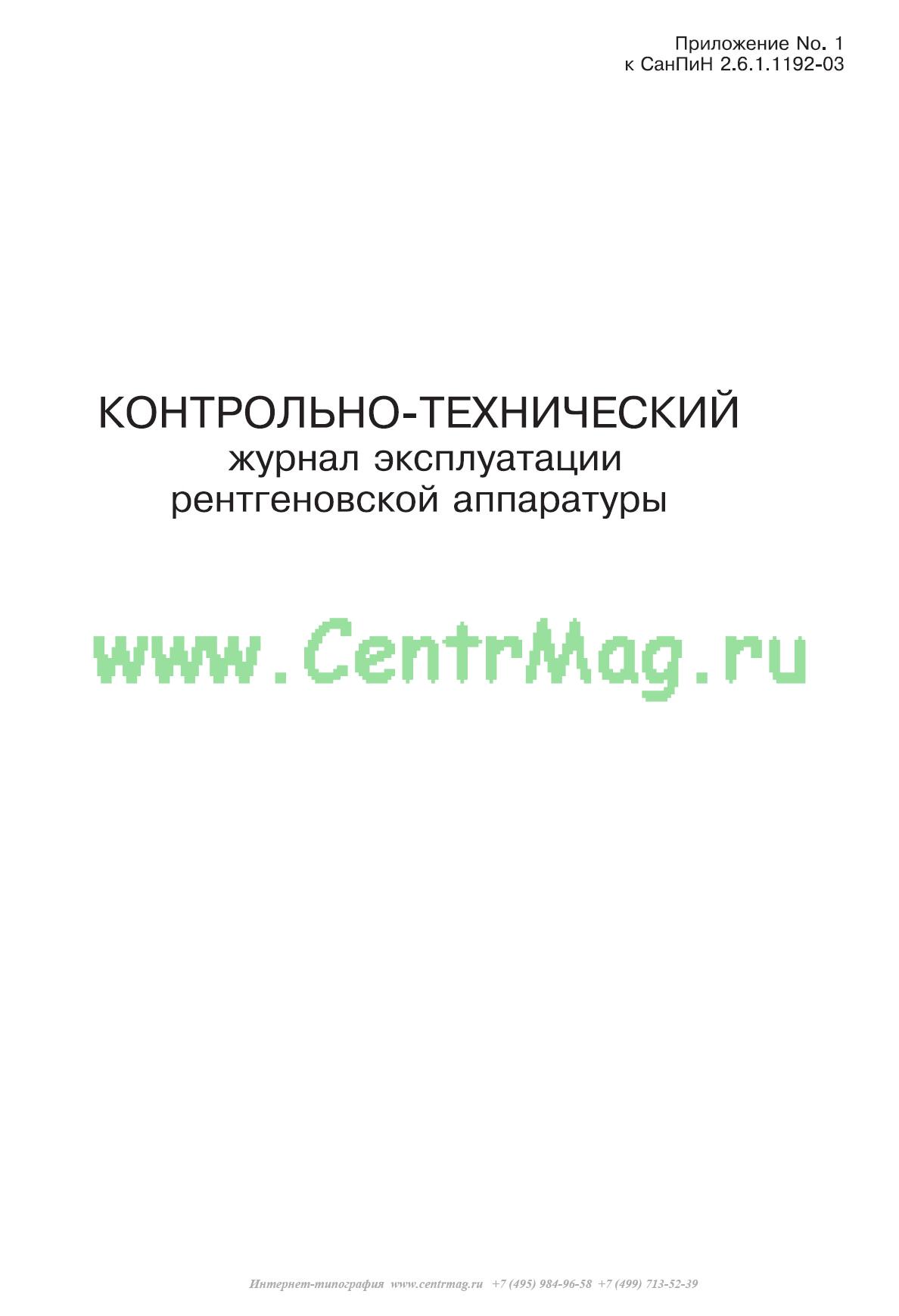Контрольно-технический журнал эксплуатации рентгеновской аппаратуры разработан и утвержден в соответствии с Санитарными правилами и нормативами СанПиН 2.6.1.1192-03 "Гигиенические требования к устройству и эксплуатации рентгеновских кабинетов, аппаратов и проведению рентгенологических исследований".