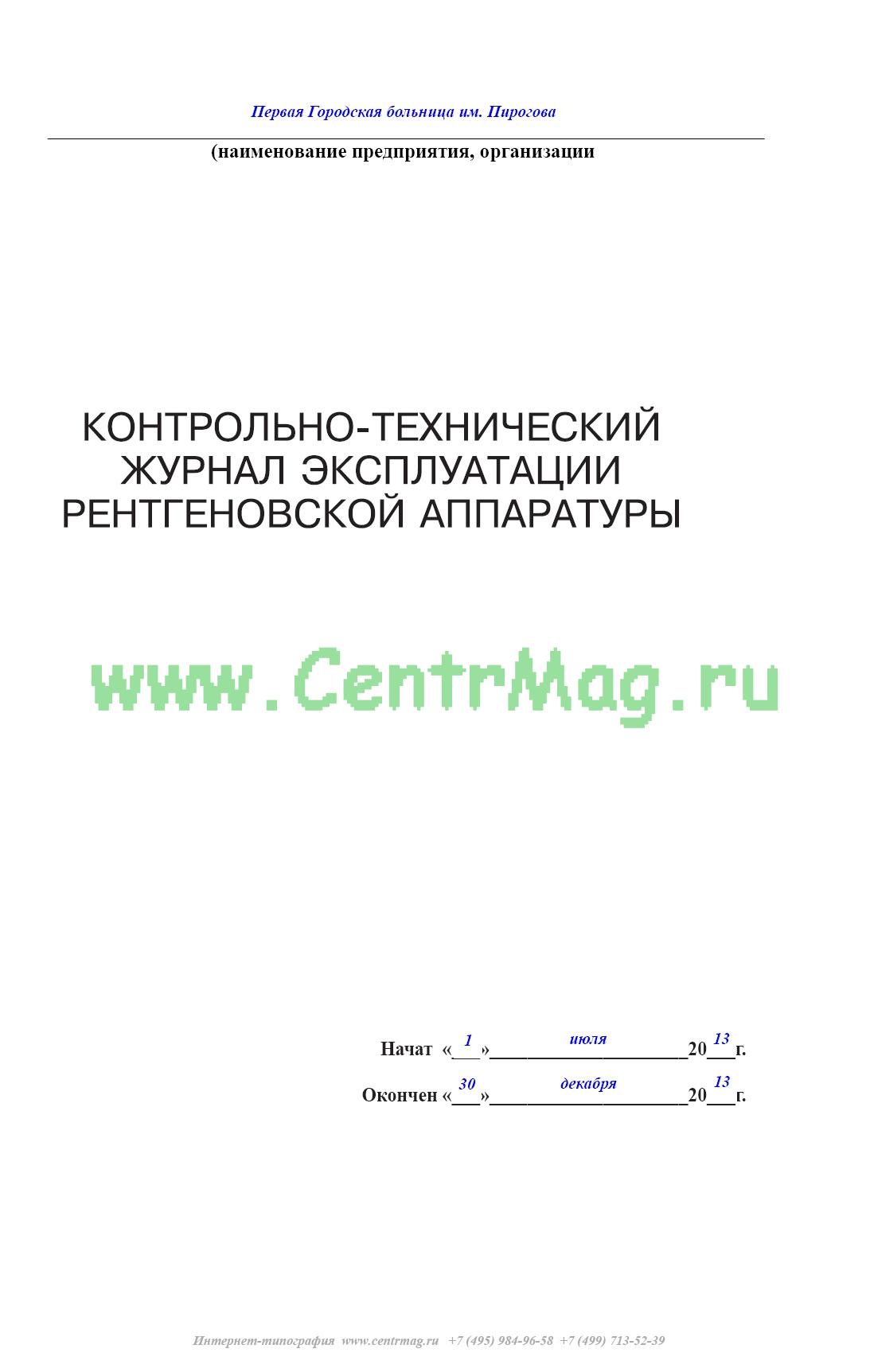 Форма контрольно-технического журнала эксплуатации рентгеновской аппаратуры идентична форме контрольно-технического журнала и определена в Приложении №1 к СанПиН 2.6.1.1192-03.