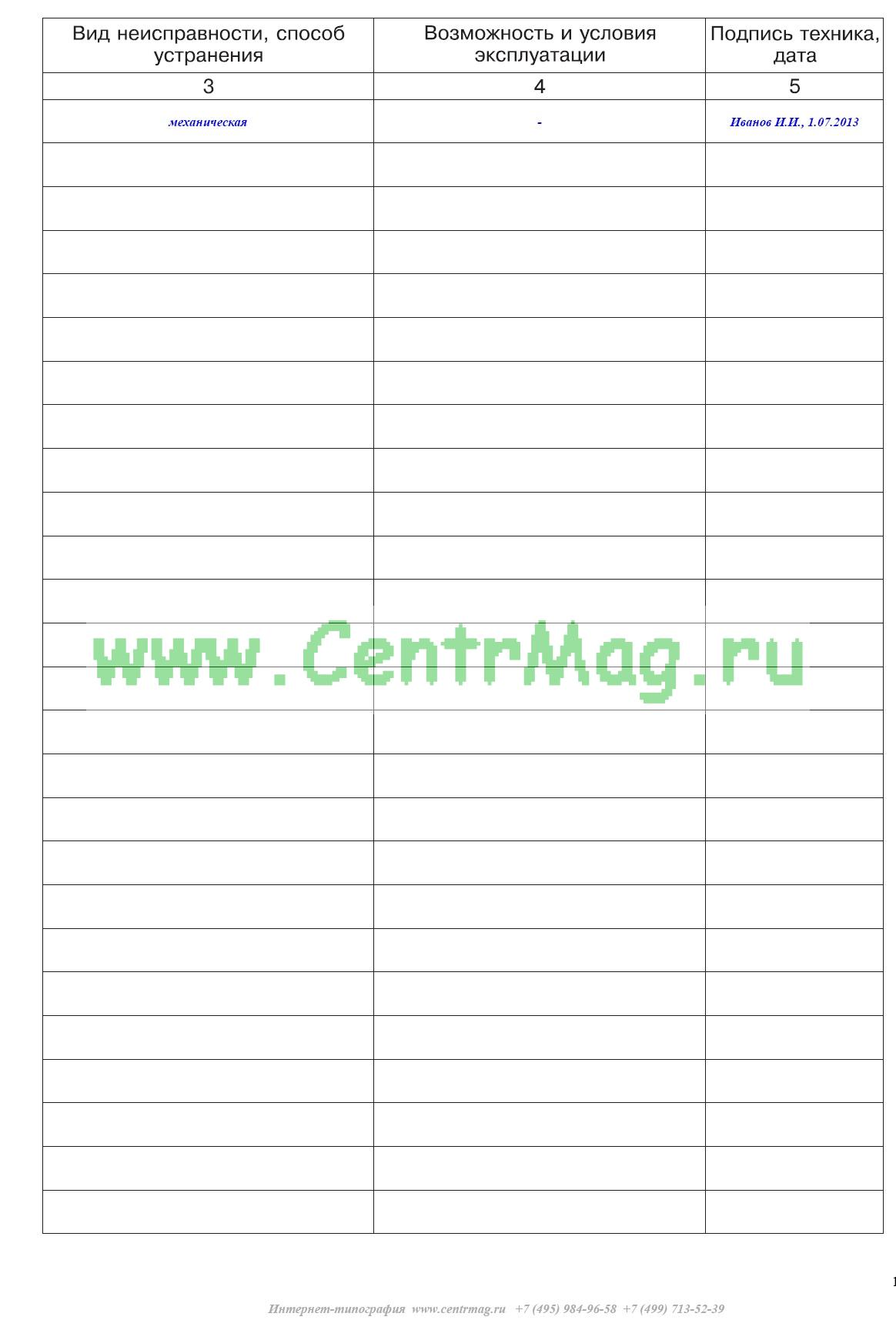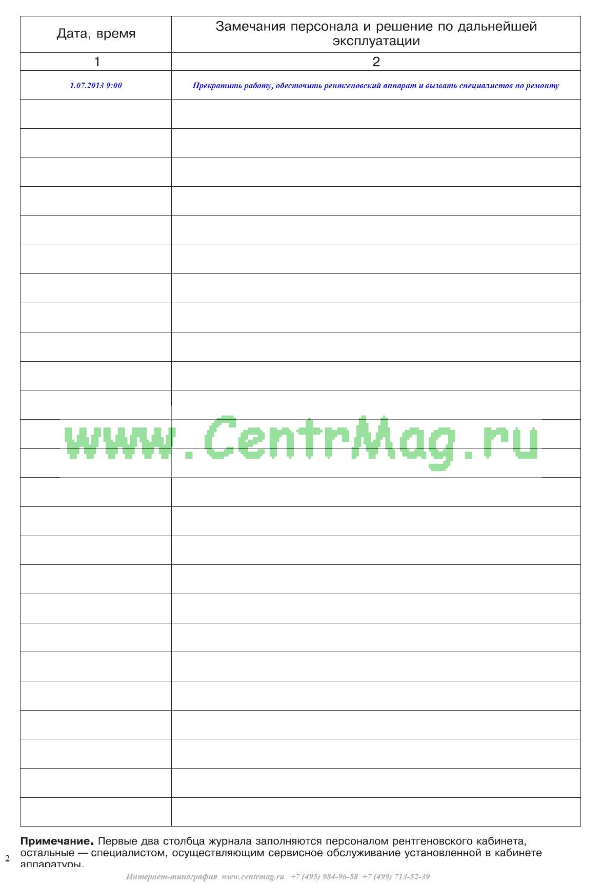 Первые два столбца заполняются персоналом рентгеновского кабинета, остальные - специалистов, осуществляющим сервисное обслуживание установленной в кабинете аппаратуры.