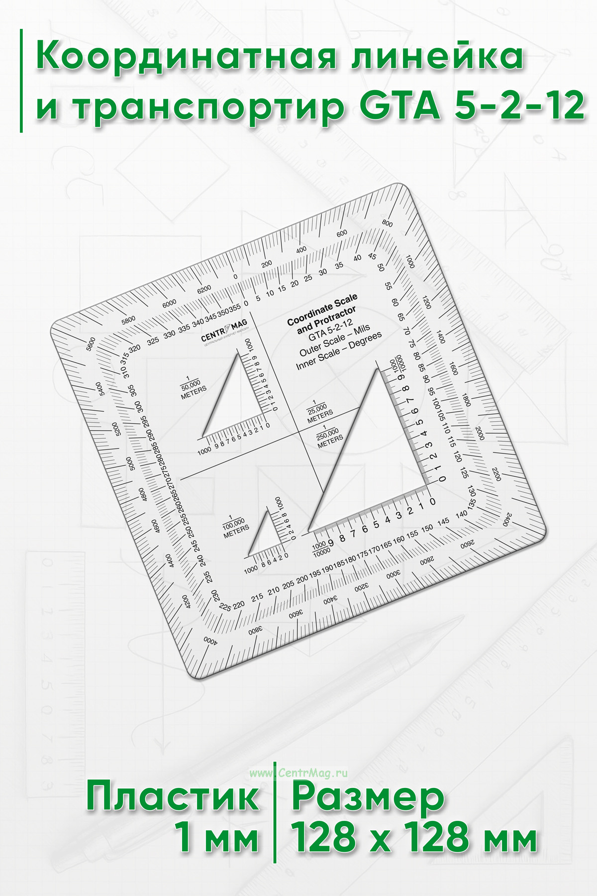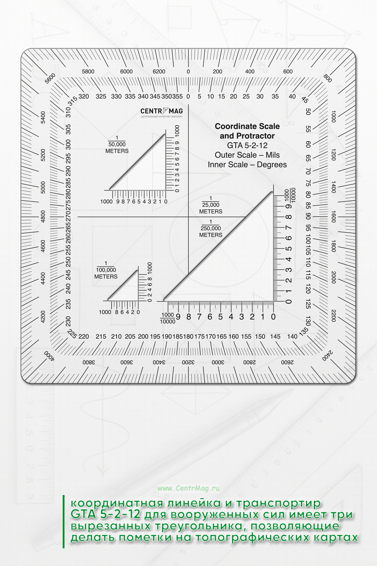 Координатная линейка и транспортир GTA 5-2-12 для вооруженных сил имеет три вырезанных треугольника, позволяющие делать пометки на топографических картах. Внутренний транспортир отмечен в градусах, а внешний - в милях.