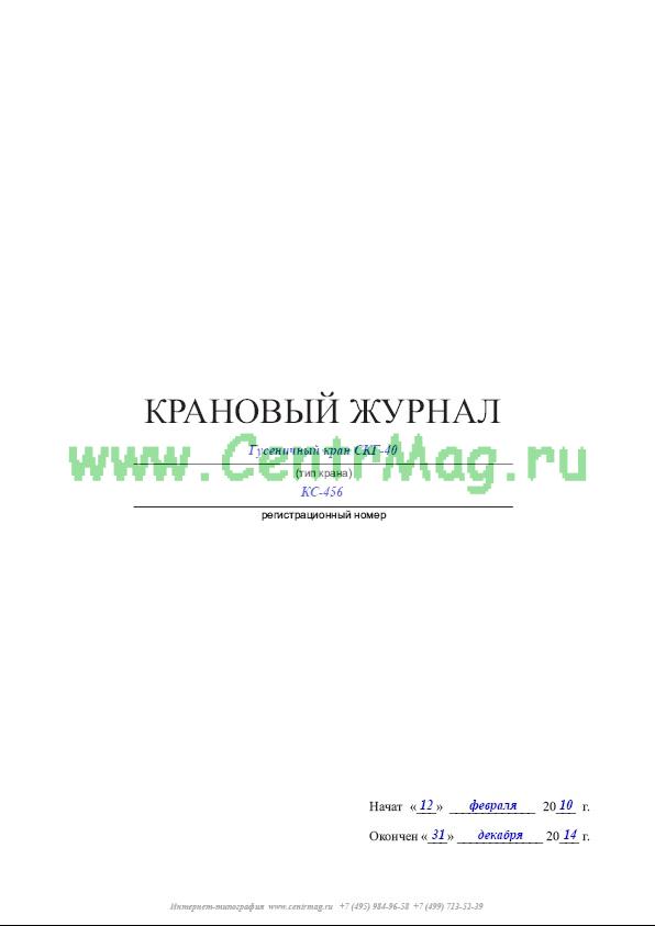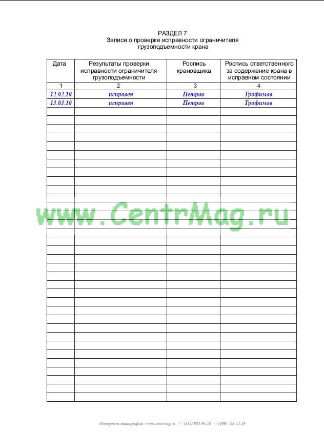 7. Ответственность за своевременное заполнение и правильное ведение журнала несет механик, в ведении которого находится кран.
