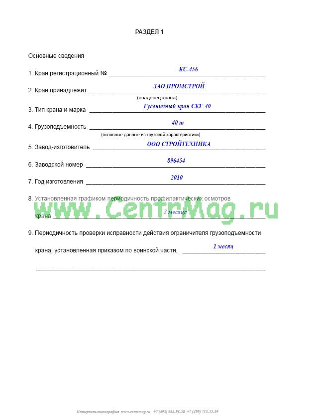 11. Раздел «Замечания о техническом состоянии, ремонтные работы и осмотры крана» заполняется лицами, несущими ответственность за техническое состояние крана и производившими осмотр (групповой механик, начальник эксплуатационного участка, представители управления механизации треста и органов надзора).