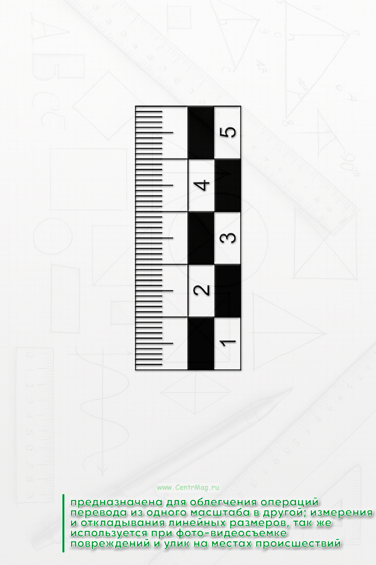 Линейка предназначена для облегчения операций перевода из одного масштаба в другой; измерения и откладывания линейных размеров, так же используется при фото-видеосъемке повреждений и улик на местах происшествий