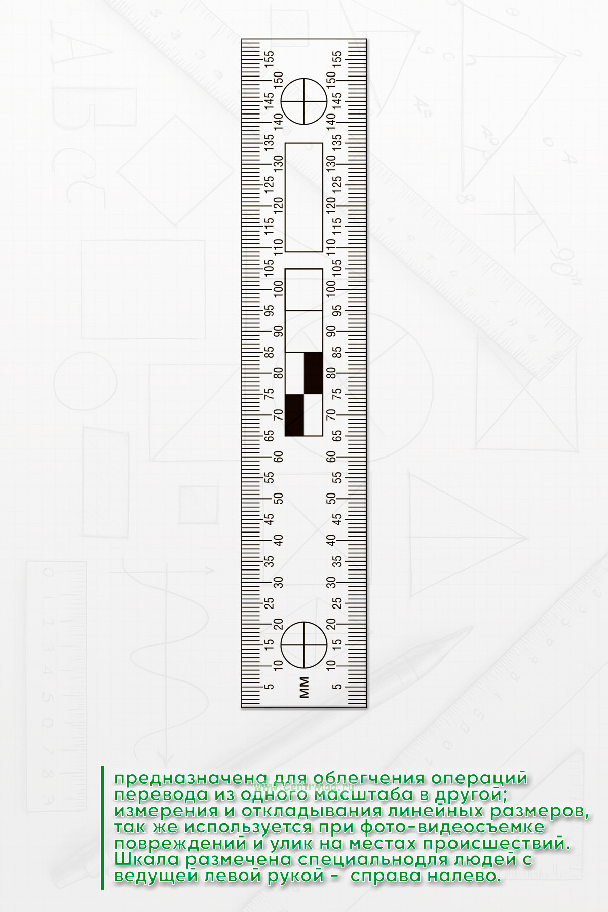 Линейка предназначена для облегчения операций перевода из одного масштаба в другой; измерения и откладывания линейных размеров, так же используется при фото-видеосъемке повреждений и улик на местах происшествий.