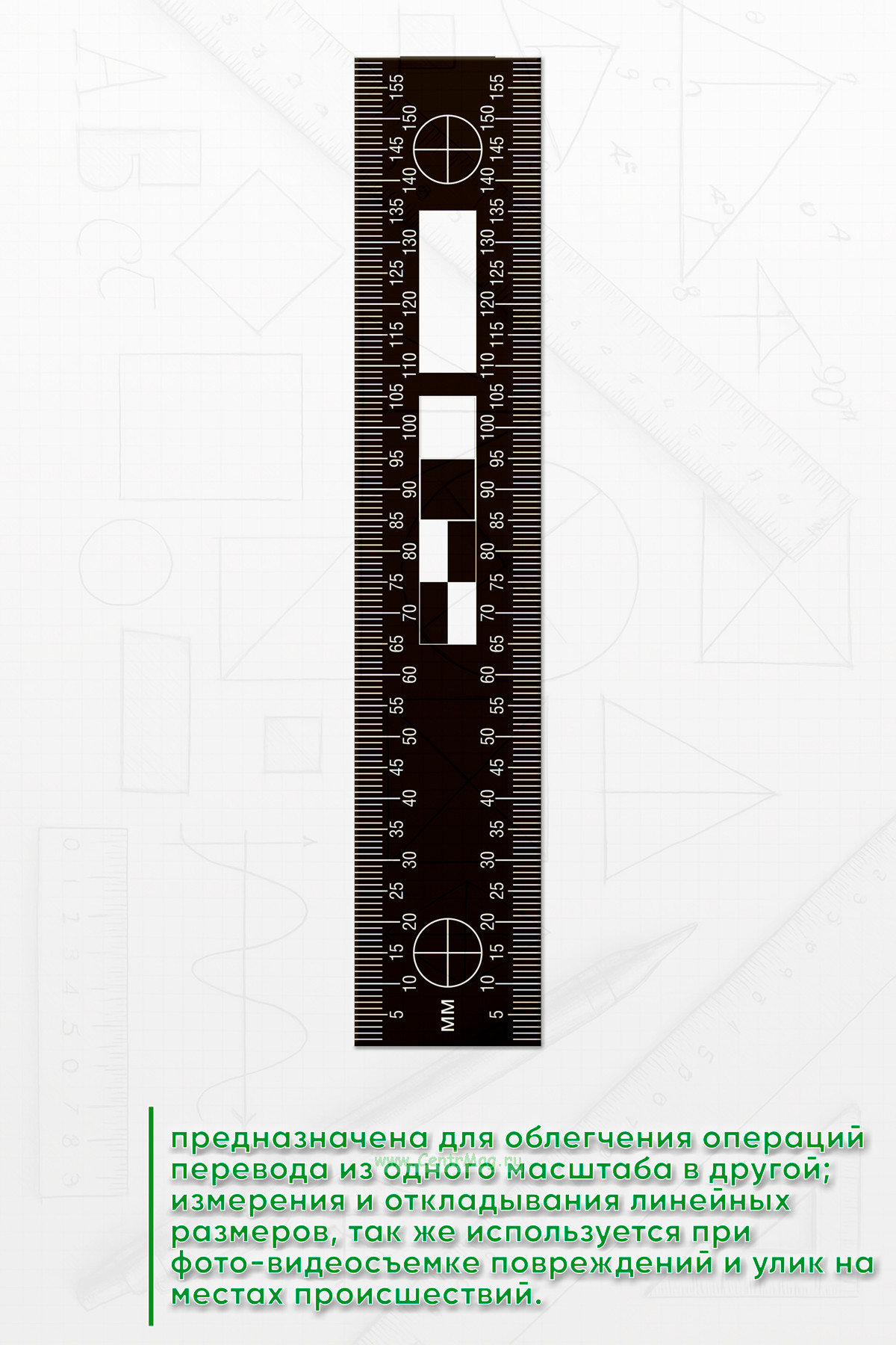 Линейка предназначена для облегчения операций перевода из одного масштаба в другой; измерения и откладывания линейных размеров, так же используется при фото-видеосъемке повреждений и улик на местах происшествий.