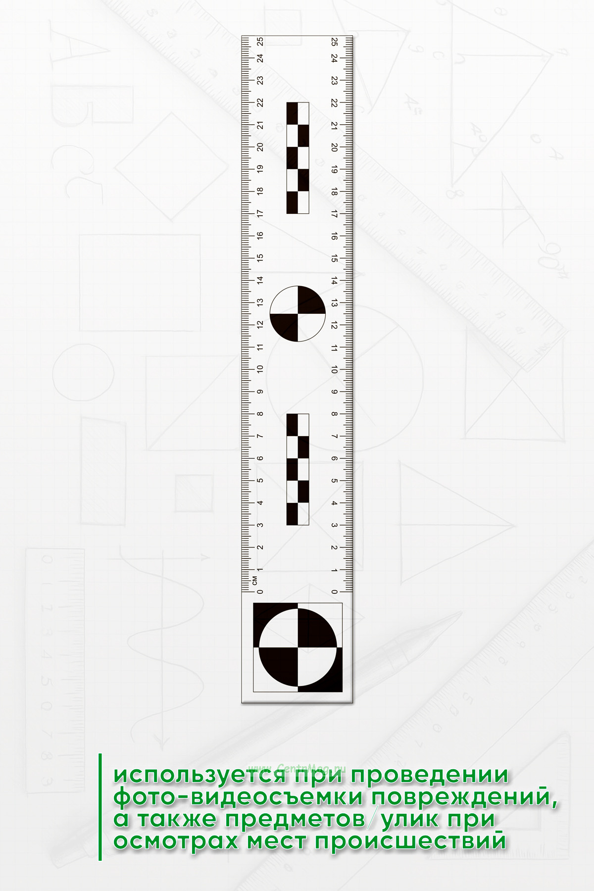 Линейка угловая используется при проведении фото-видеосъемки следов обуви, а также других предметов и улик при осмотрах мест происшествий