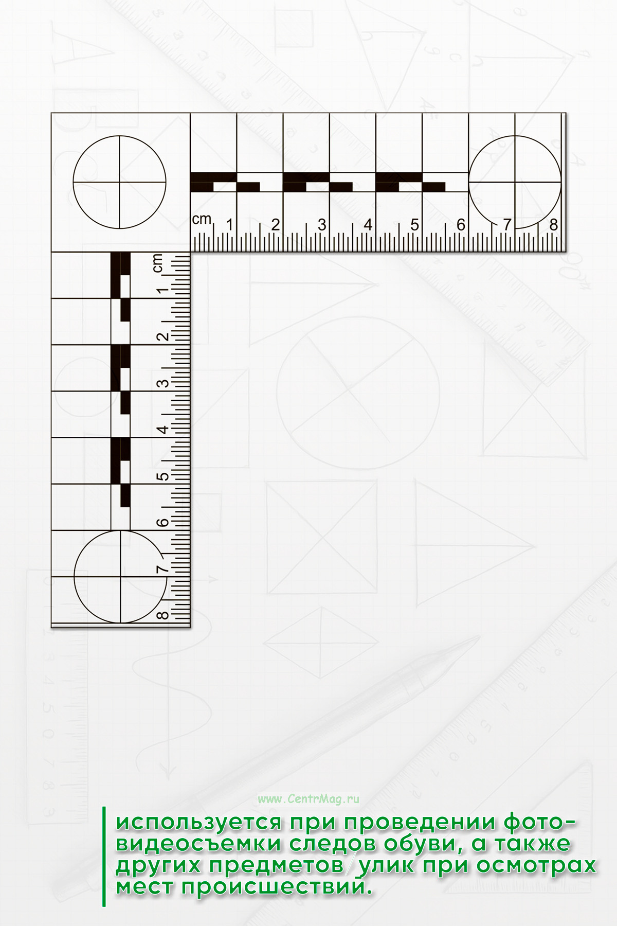 Линейка используется при проведении фото-видеосъемки следов обуви и других предметов/улик при осмотрах мест происшествий, так же может быть использована в других сферах деятельности, позволяет определить точную площадь повреждения при съемке