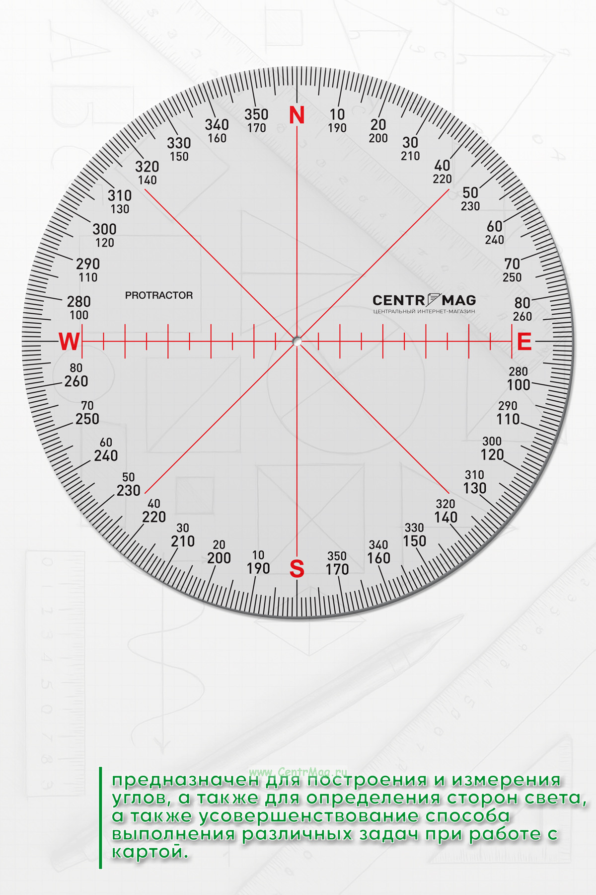 Круговой транспортир относится к чертежным принадлежностям, которые используются при работе с носителями информации о местности, а также с картами, фотокартами различных масштабов. Транспортир предназначен для построения и измерения углов, а также для определения сторон света. Техническим результатом использования является повышение точности, скорости, а также усовершенствование способа выполнения различных задач при работе с картой.