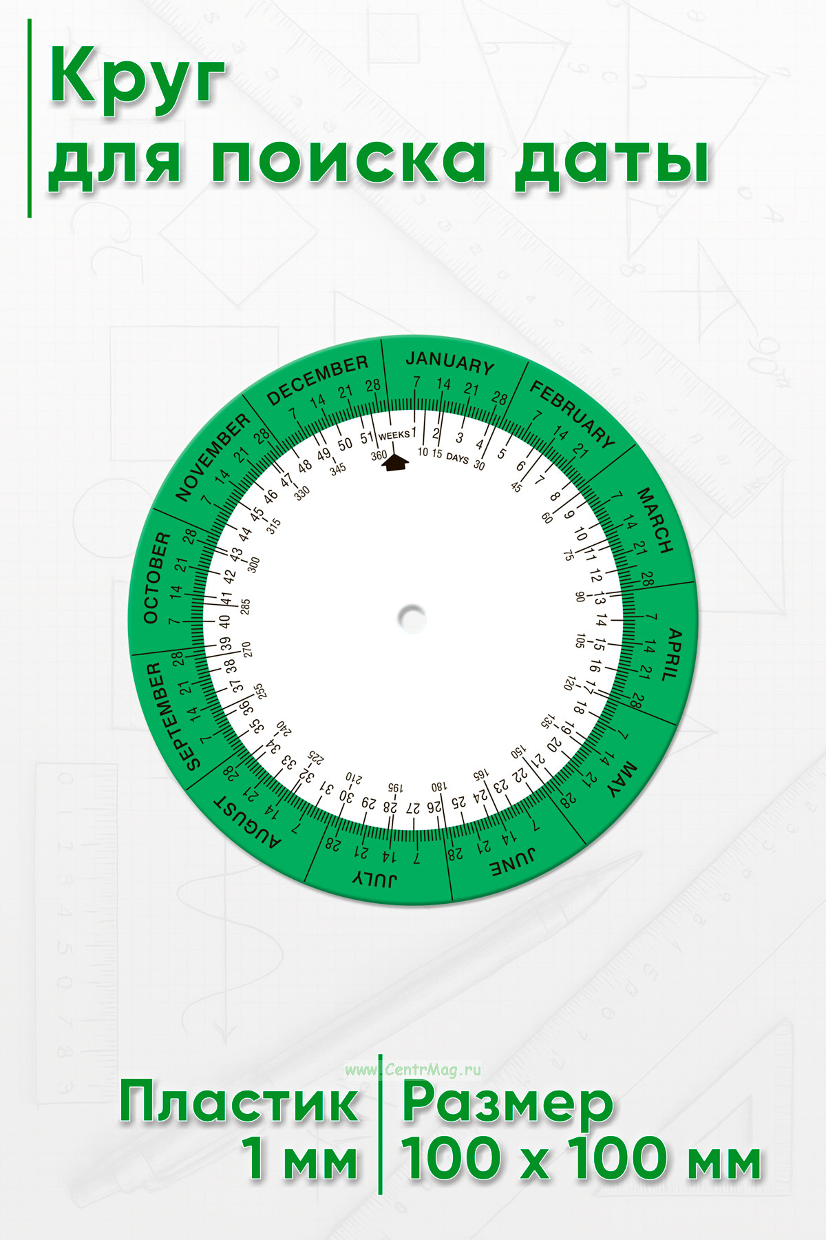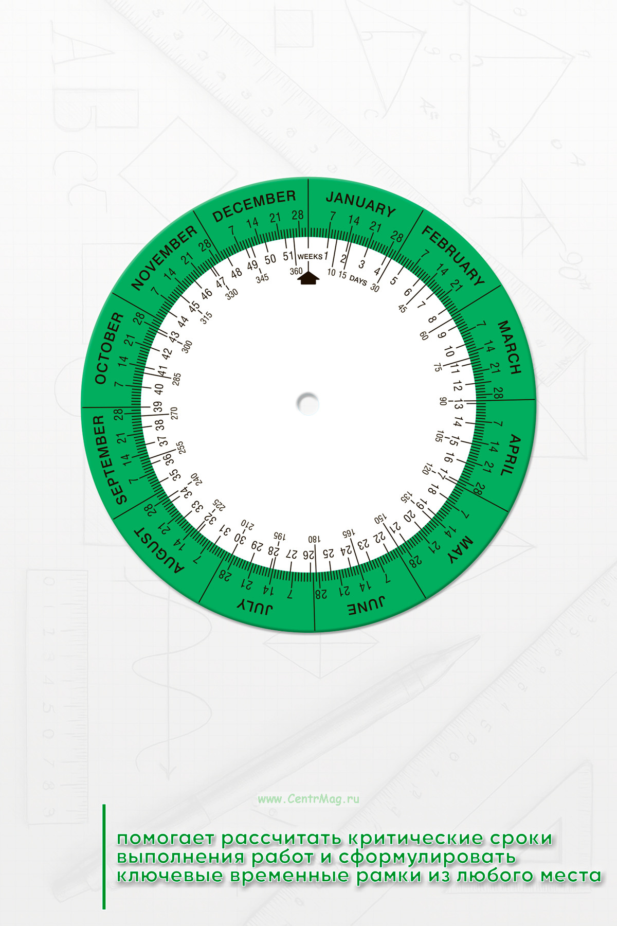 Поисковик дат помогает рассчитать критические сроки выполнения работ и сформулировать ключевые временные рамки из любого места. Необходимо установить стрелку на дату начала, затем по часовой стрелке рассчитать желаемое количество недель для определения даты окончания