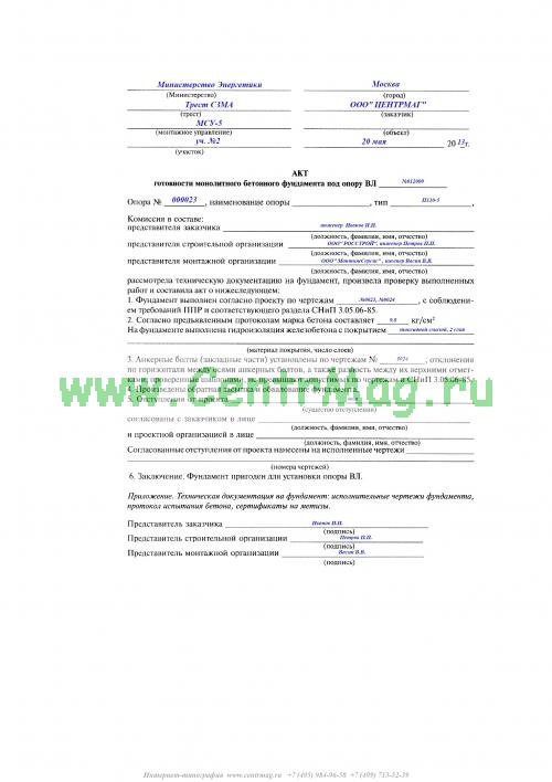 Одним из видов исполнительной документации в строительстве является акт готовности монолитного фундамента. Акт готовности монолитного фундамента под опору ВЛ заполняется комиссией в составе: