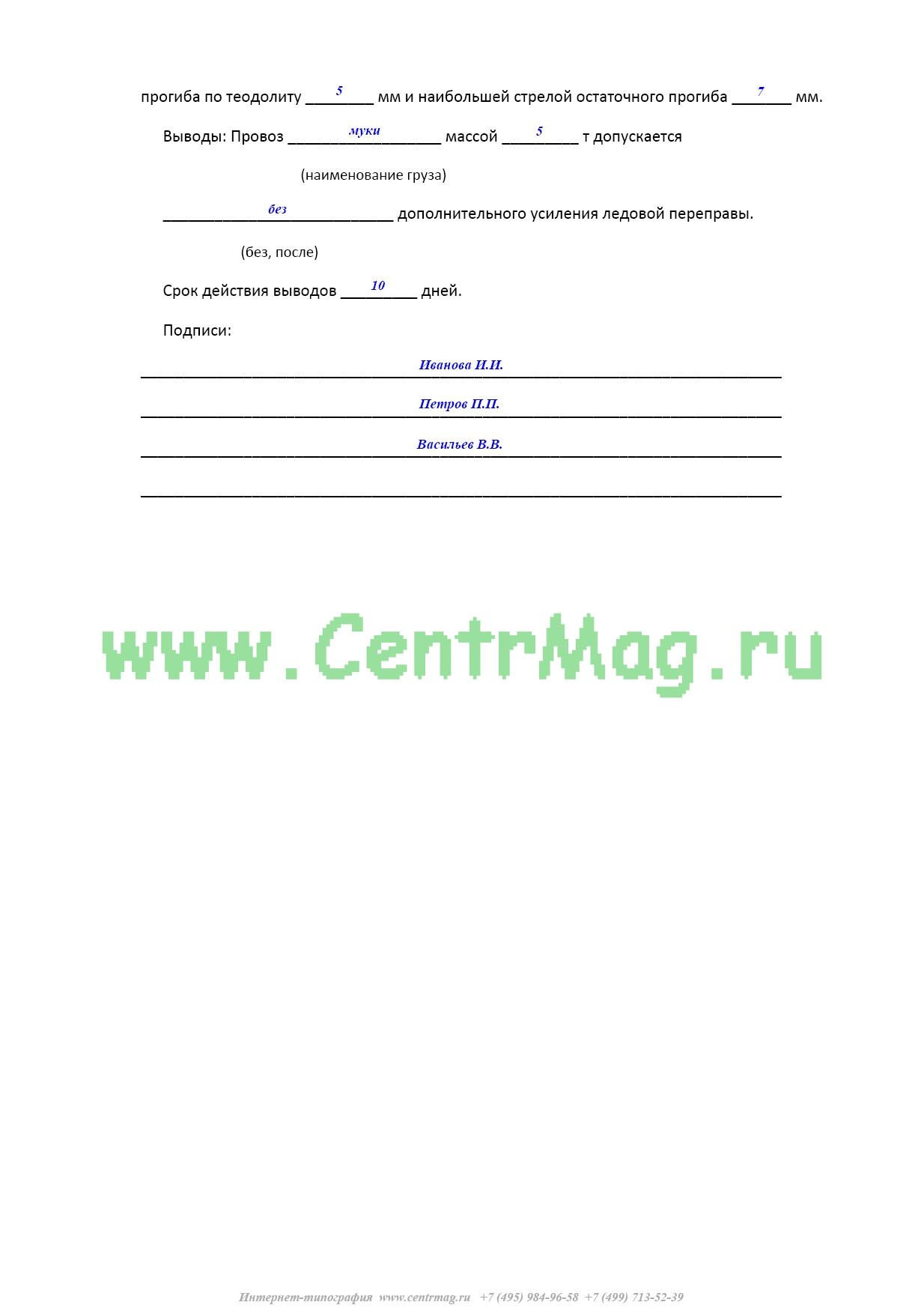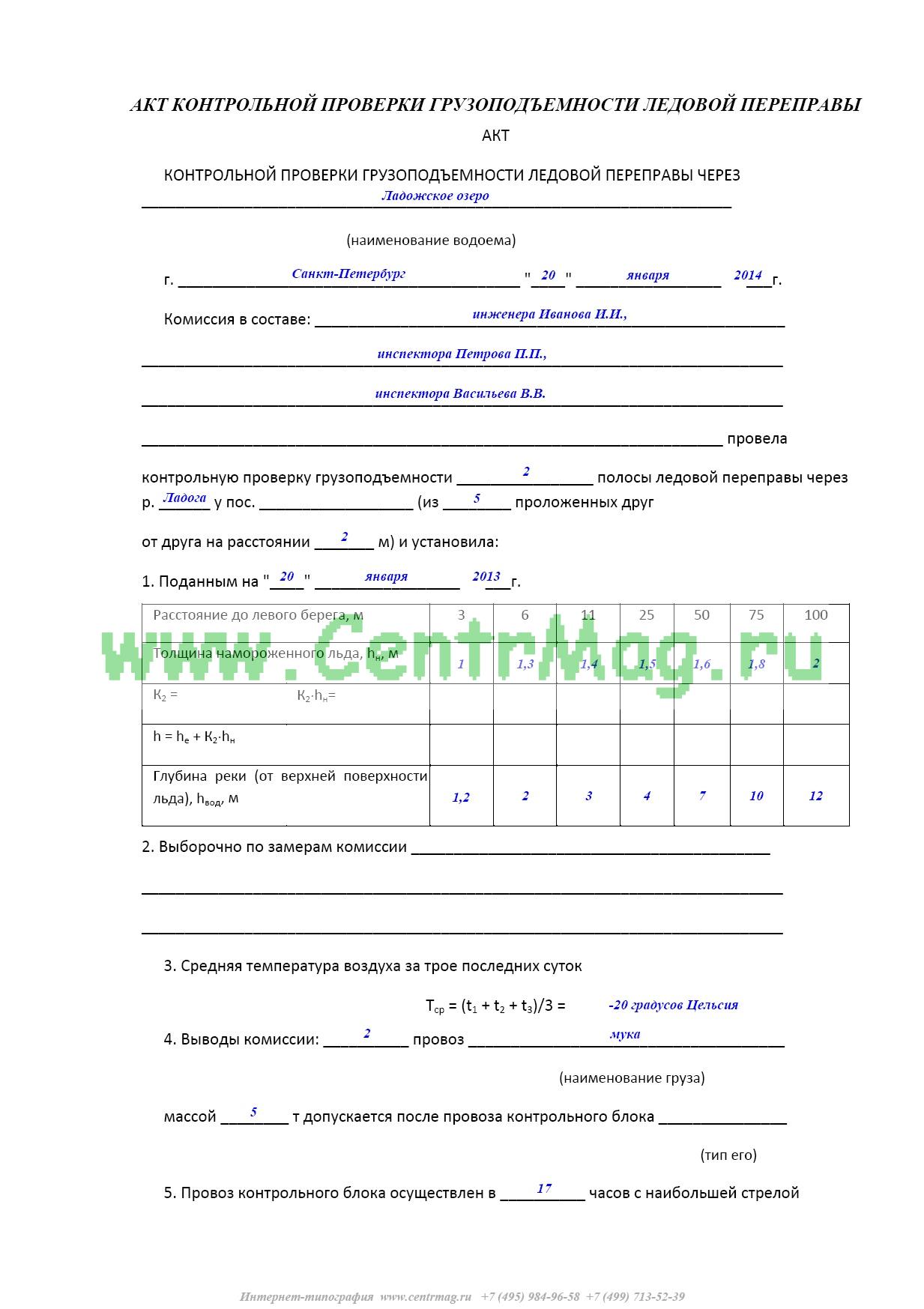 Образец и пример заполнения акта контрольной проверки грузоподъемности ледовой переправы