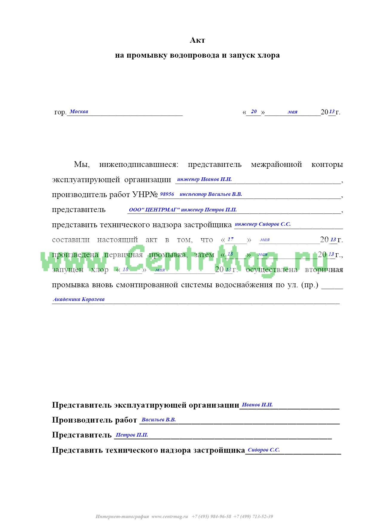 Образец и пример заполнения акта на промывку водопровода и запуск хлора