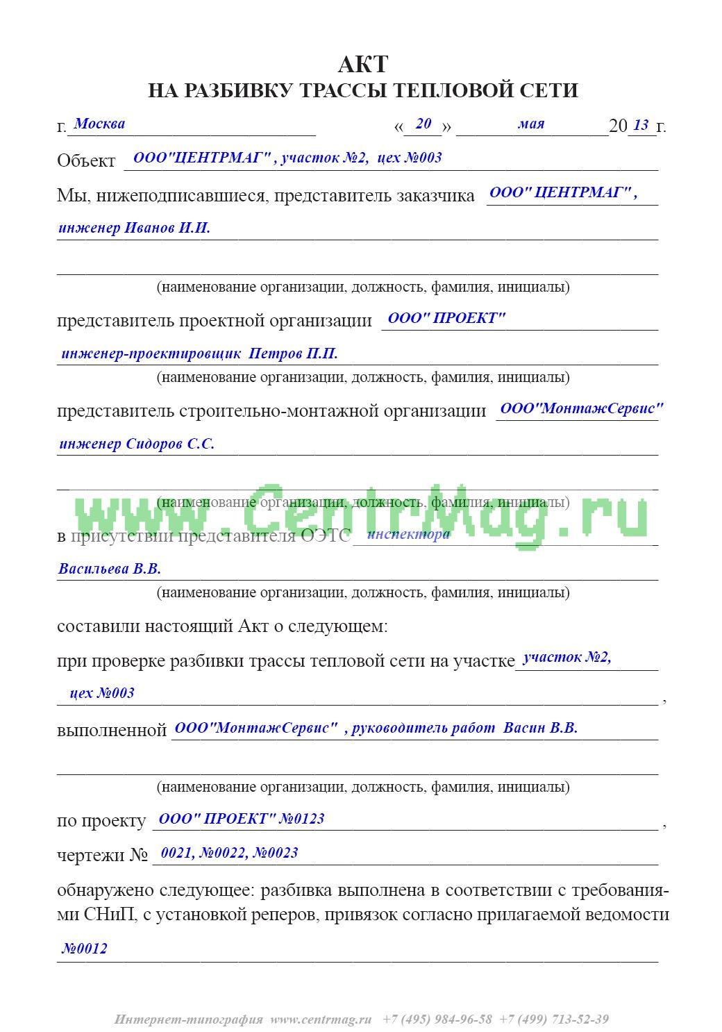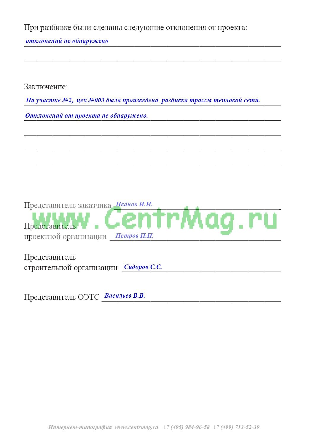 Акт на разбивку трассы тепловой сети - бланк формата А4 с оборотом