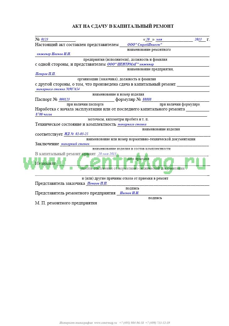Образец и пример заполнения акта на сдачу в капитальный ремонт