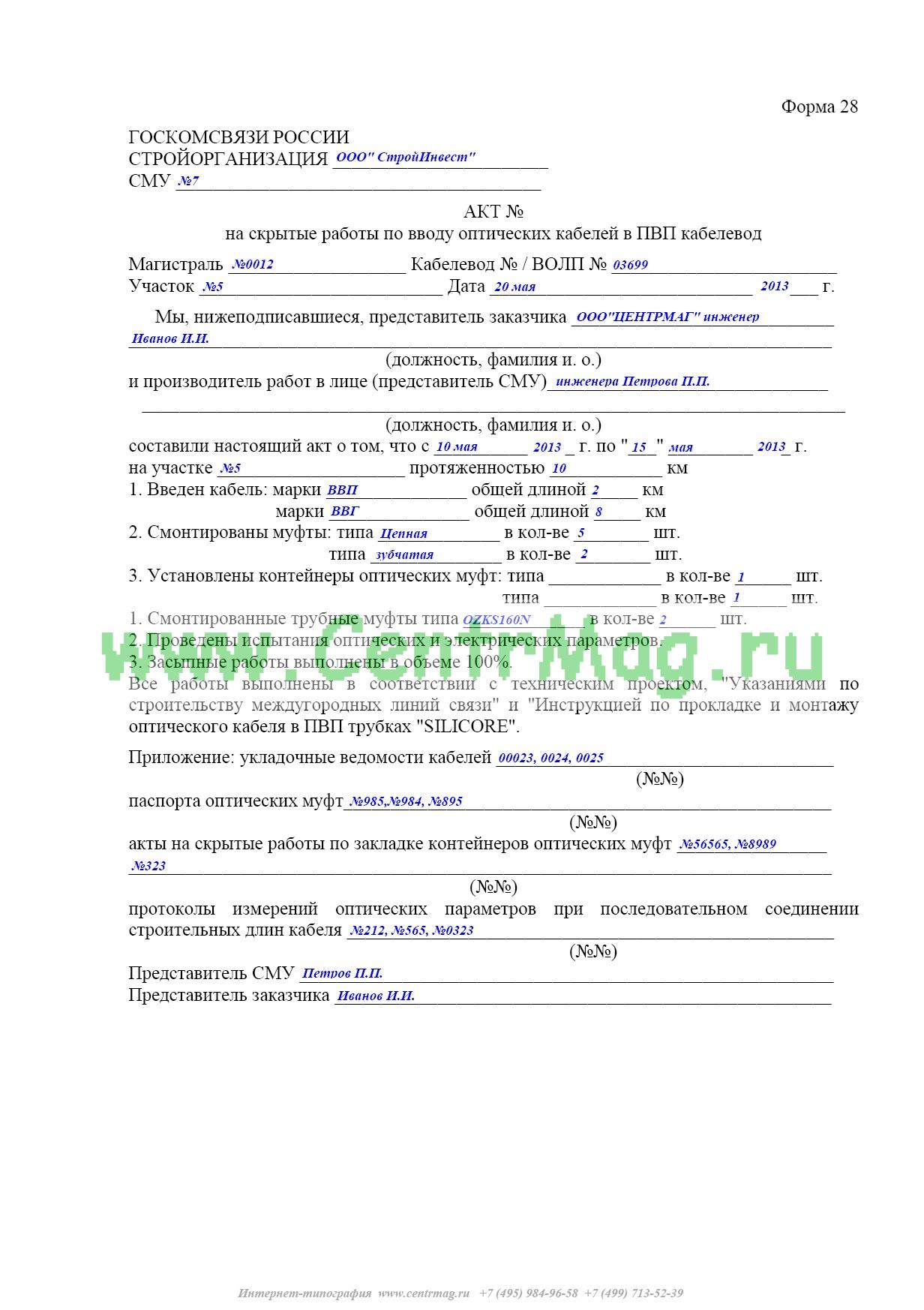 Образец и пример заполнения акта на скрытые работы по вводу оптических кабелей в ПВП кабелевод
