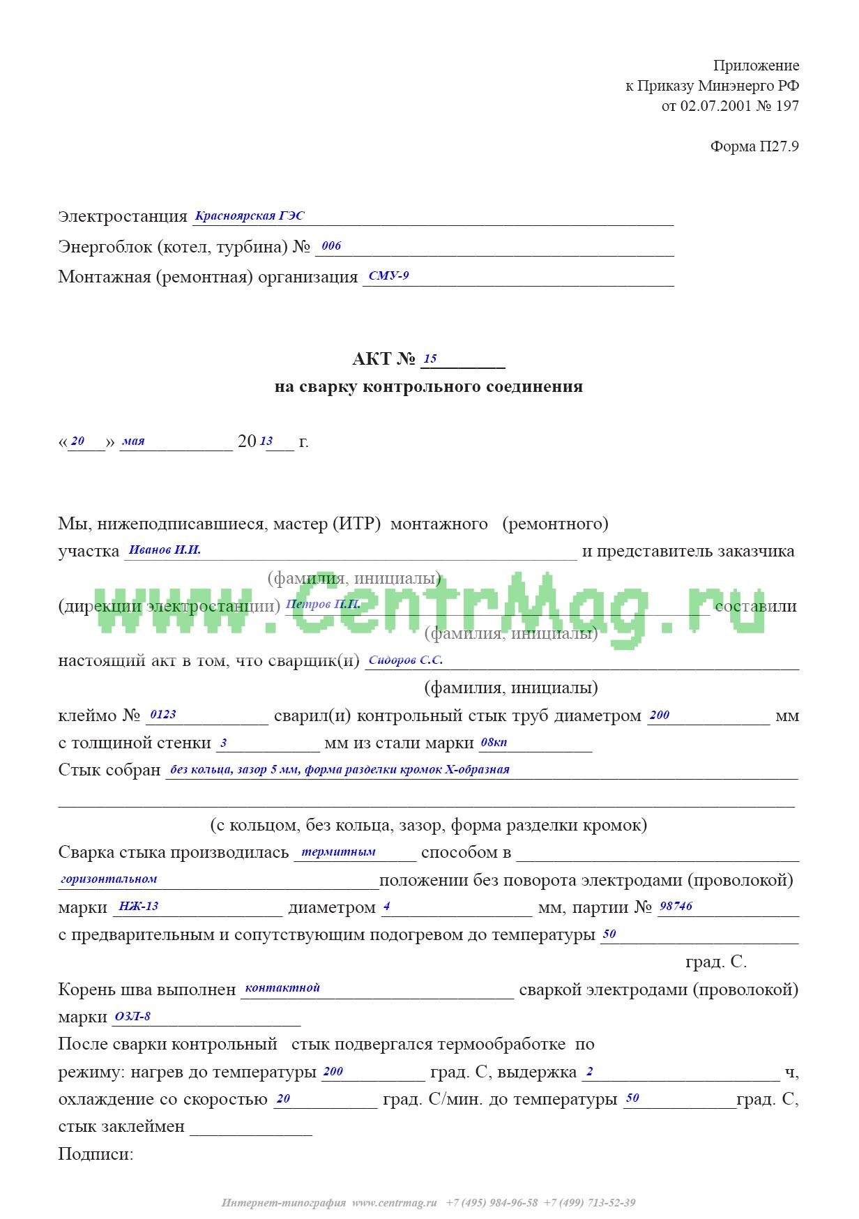 Форма акта на сварку контрольного соединения (форма № 27.9) соответствует Приложению к РД 153-34.1-003-01 Сварка, термообработка и контроль трубных систем котлов и трубопроводов при монтаже и ремонте энергетического оборудования.