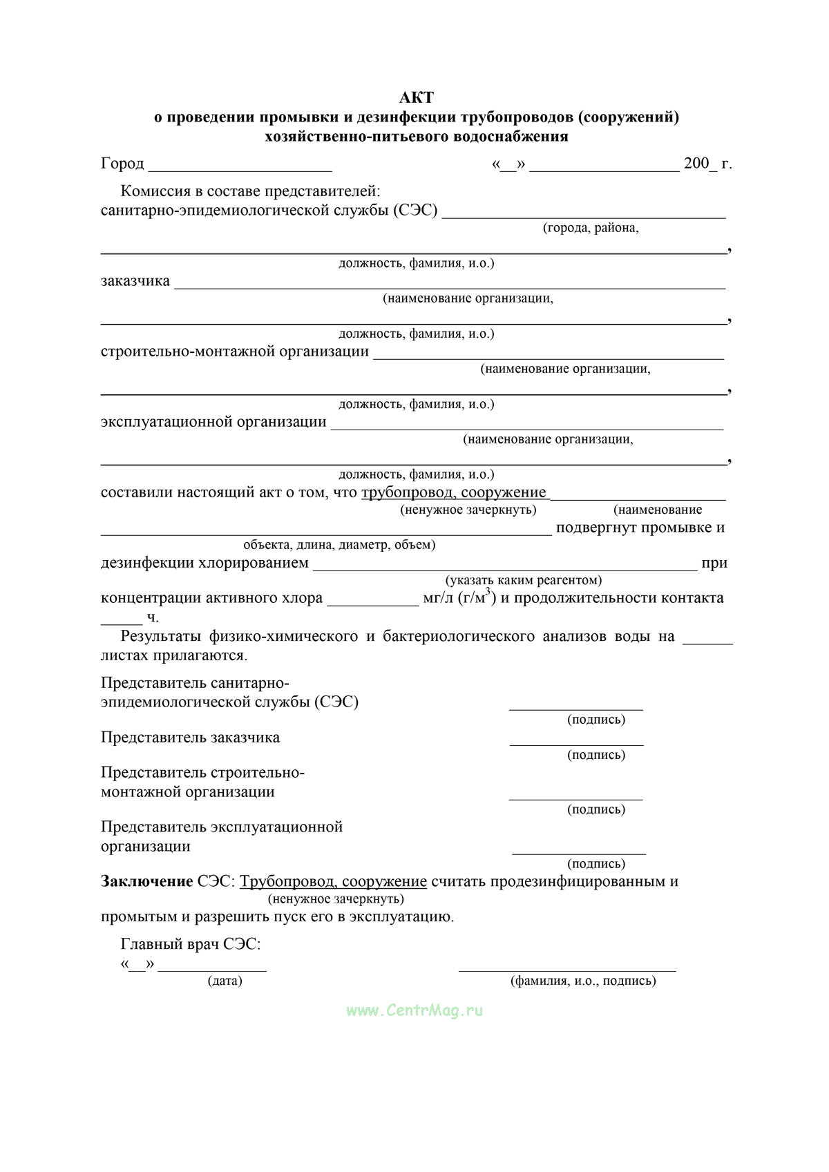 Акт о проведении промывки и дезинфекции трубопроводов (сооружений) хозяйственно-питьевого водоснабжения продается только как чистый незаполненный бланк, без печатей и подписей соответствует 149-ФЗ от 27.07.2006