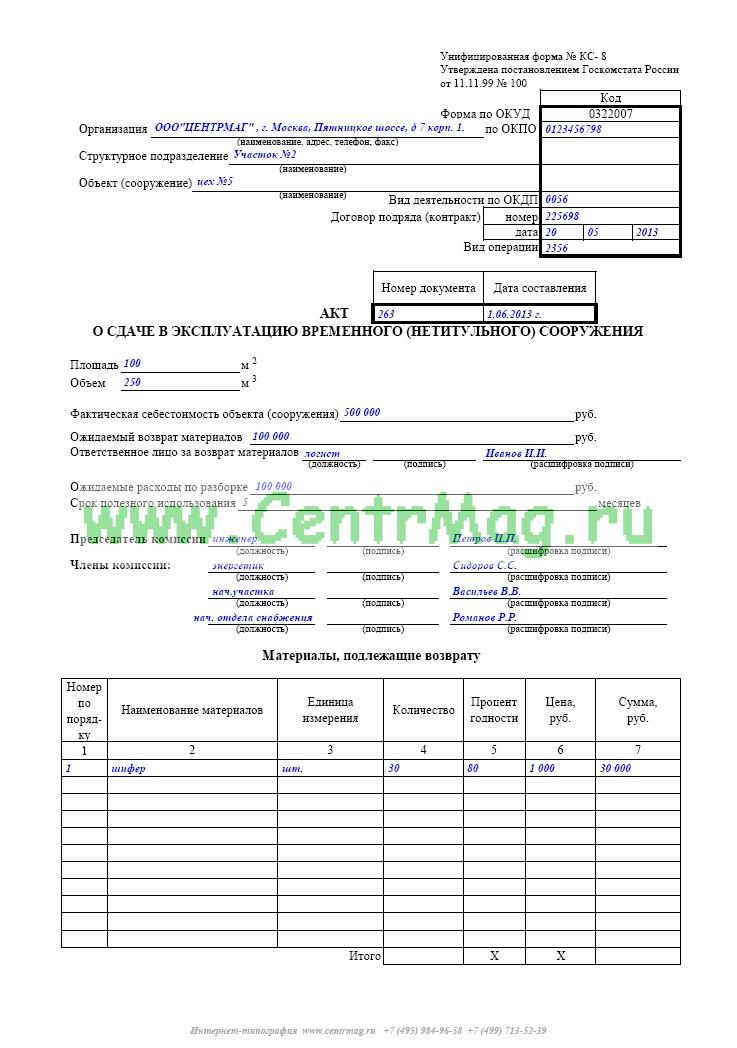 Акт о сдаче в эксплуатацию временного (нетитульного) сооружения, форма КС-8 соответствует Постановлению Госкомстата РФ от 11.11.1999 № 100 "Об утверждении унифицированных форм первичной учетной документации по учету работ в капитальном строительстве и ремонтно-строительных работ"