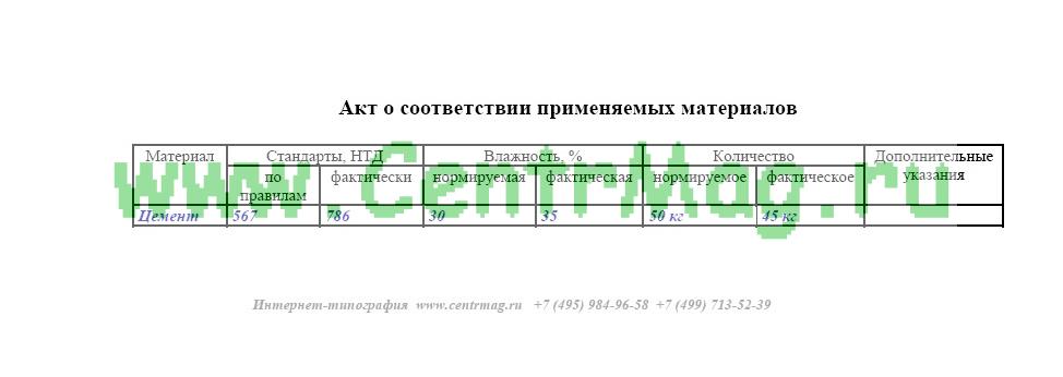 Образец и пример заполнения акта о соответствии применяемых материалов