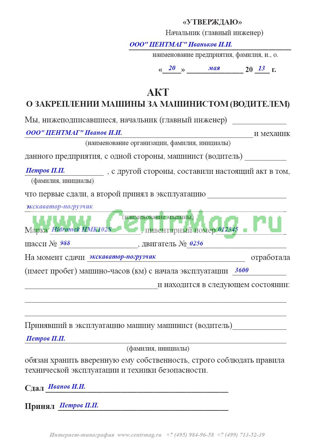 Образец и пример заполнения акта о закреплении машины за машинистом (водителем)